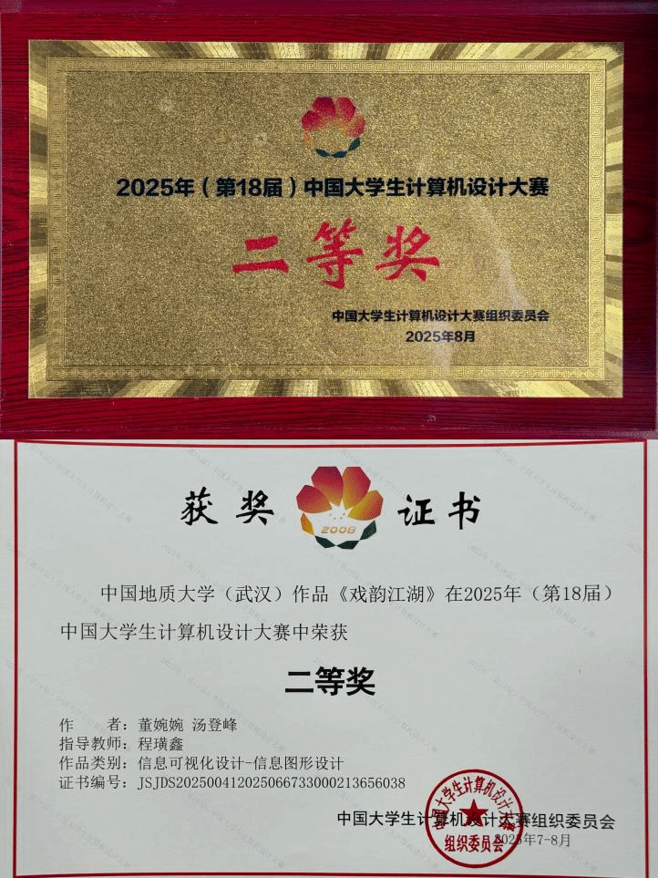 环境设计系支部书记程璜鑫副教授指导,董婉婉、汤登峰同学创作的作品《戏韵江湖》在信息可视化设计专业组中脱颖而出,荣获全国二等奖。