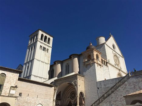 8月25日,实习小组驾车来到了意大利翁布里亚大区佩鲁贾省的亚西西小镇。亚西西年代久远,是一座建于山上的中世纪古镇。老师先带着小组参观了著名的圣弗朗西斯科大教堂(亦作圣方济各大教堂),教堂高大圣洁,建在小山的一侧,它的结构包括上教堂和下教堂,和安放圣弗朗西斯科遗体的墓穴,以及附属的修道院。圣弗朗西斯科大教堂内是意大利画家西蒙•马丁尼,契马布埃以及他的徒弟,文艺复兴绘画艺术的开创者——乔托等人的壁画,是这一时期意大利艺术的重要象征。
