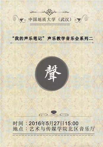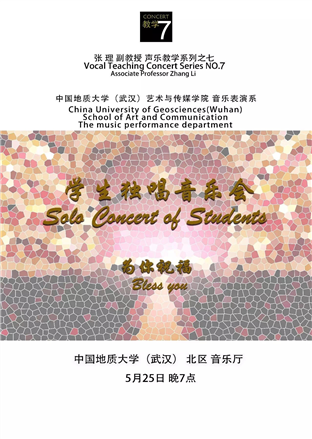 、音乐表演系、“张理副教授声乐教学系列之七——学生独唱音乐会”,源于2009——2012年校级本科《声乐精品课程教学》教学研究项目和2015年湖北省《声乐精品资源共享课程》教学项目(《声乐》是2015年,韩国三级