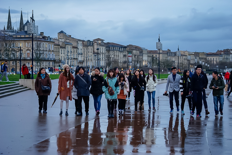 晚18点05分,访学团经过凯旋门,穿过街巷,抵达波尔多老城区,并沿加龙河河岸一路行走,两岸已渐春意阑珊,却还带着一丝料峭的清寒。站在加龙河的河岸边,马林老师向访学团介绍道:“波尔多是加龙河的入海口,而沿河一带则是波尔多最经典也最精彩的地方。波尔多虽处在法国南部,却是典型的法兰西城市,亦有“小巴黎”之称。”并表示:“加龙河畔的沿河大道是法国最大的沿河大道,即使是巴黎,也找不出这么大这么美的沿河大道”。语毕,马林老师即带领访学团沿加龙河行至共和国广场,邀访学团成员在此合影留念,并示意访学团可在合影结束后自行在此观赏。