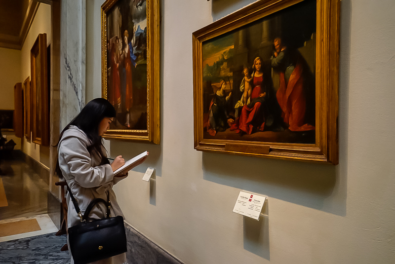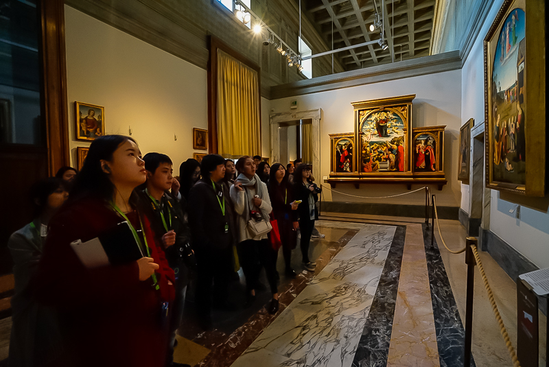 马林老师首先针对博物馆的油画作品,从绘画艺术的宗教、文化、风格等多个方面为访学团进行讲解。在谈到拉斐尔时,他认为:“拉斐尔的作品《耶稣显灵》较能体现拜占庭到文艺复兴时期的空间维度变化,虚实关系的转变,从缺乏人性没有动态到后面的充满人文情怀,其在西方艺术史上亦占有重要地位”。此后,欧洲访学团又参观了波提切利、提香、达芬奇以及贝里尼等名师的作品,在马林老师的讲解下,对博物馆内的油画作品有了进一步的了解。