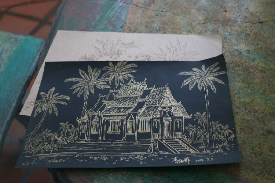 (摄影 王铭毓)九月五日上午,老挝实习写生组师生一行参观世界文化遗产地琅勃拉邦,从居住旅馆出发,静访香通寺,途径老皇宫,当地早市,沿湄公河岸环行,了解当地风土人情,随后写生组开始第一天的写生活动,写生组当天主要集中在老皇宫中以宫殿建筑为主体进行写生。