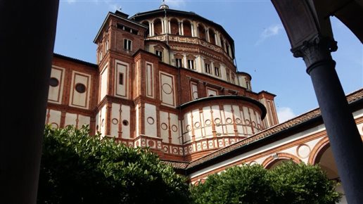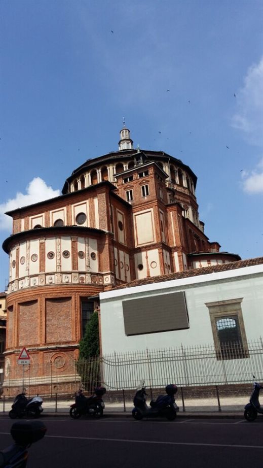当地时间6月16日上午,当代艺术系教师来到米兰市内的圣母玛利亚感恩教堂,文艺复兴时期的艺术巨匠达芬奇的名作《最后的晚餐》就在这座教堂内修道院的墙上。精确的透视使画面与整个墙面融为一体,空间感极强。教师们第一次在现场看到真迹,极具震撼力。画作几百年来进行了多次修复,非常脆弱,禁止照相,且分时限时参观。走廊墙上挂有复制品,供参观者多次观摩。此外,这座教堂建筑本身也很有特色,被列为世界文化遗产。由文艺复兴时期著名的建筑大师布拉曼特设计,其旋转渐进式的外观极其壮美。