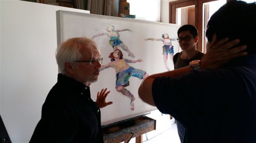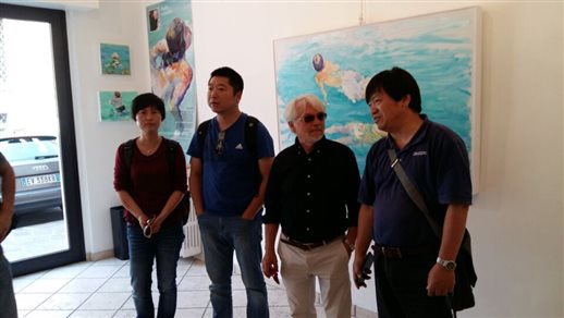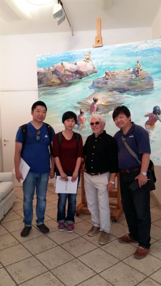 当地时间6月15日,世界文化遗产古城曼托瓦(mantova),当代艺术系教师与居住于此的意大利艺术家克劳迪奥(claudio)见面。克劳迪奥热情的引导大家参观他的画廊和工作室,与教师们一起分享他的创作理念,交流讨论当代艺术现状与走向。临别,他向教师们赠送了画册,并表达了与韩国三级 师生交流合作的强烈愿望。