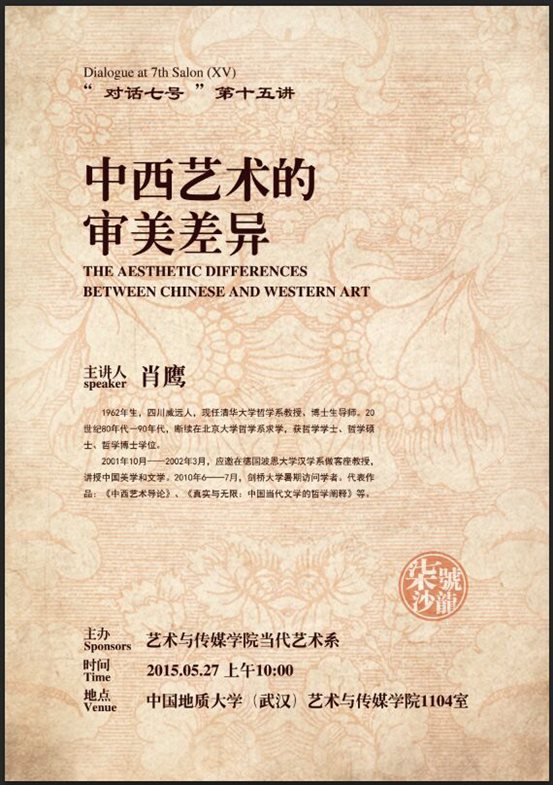 讲座中肖鹰教授就艺术与现实,商业价值与艺术价值谈及自己的看法,说到这是个人的定位问题,在当代对待中西方两种文化应持有一种“认识我自己”的苏格拉底精神,形成自己的理解与特点。他认为中国文化在世界文化体系中是一个独立的体系,具有独特的价值。