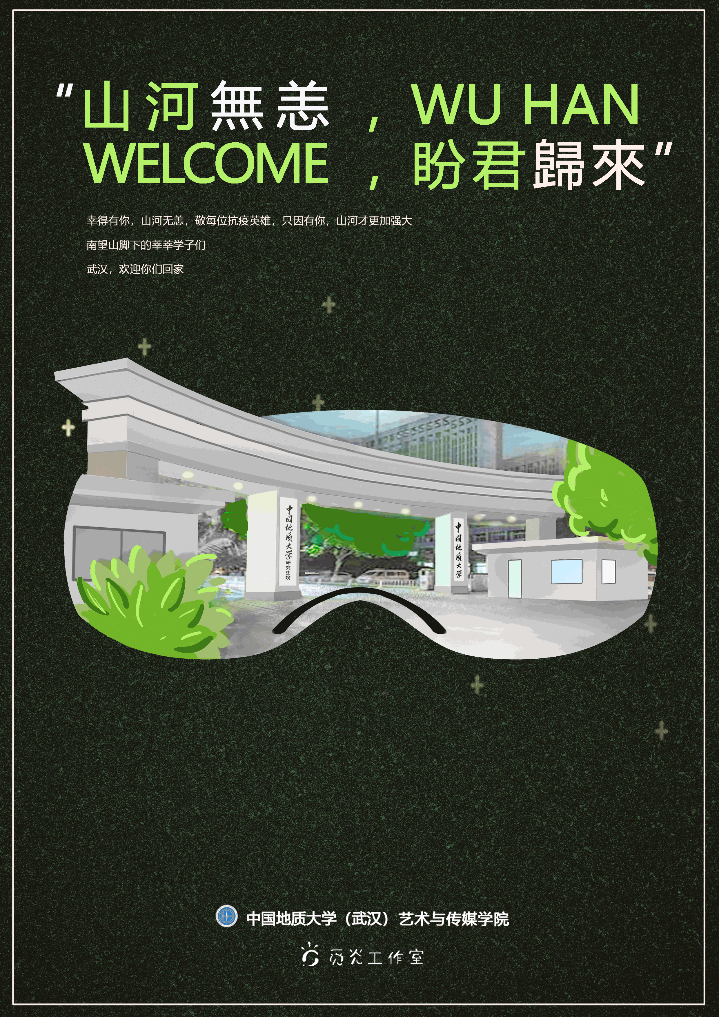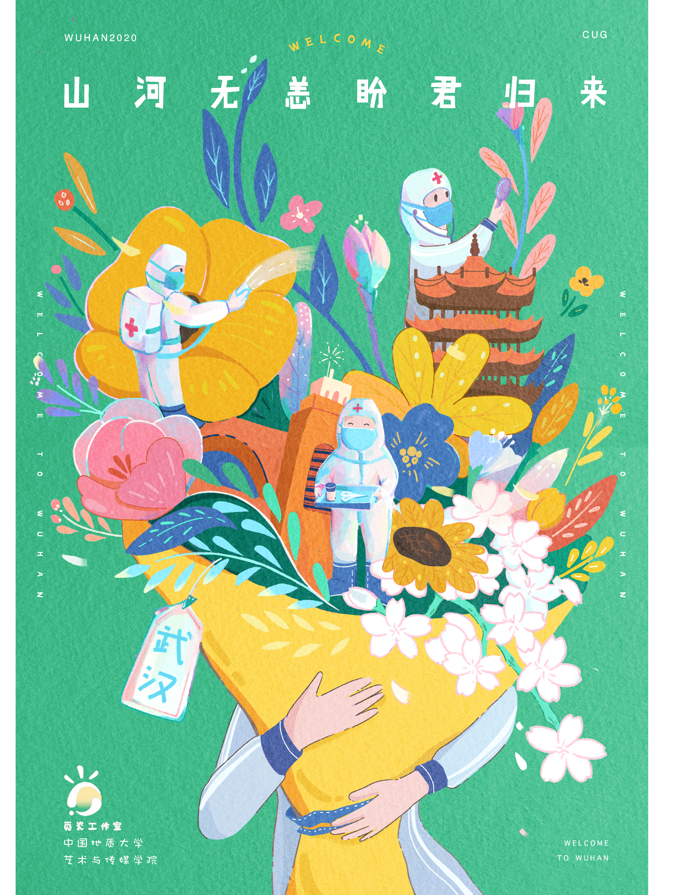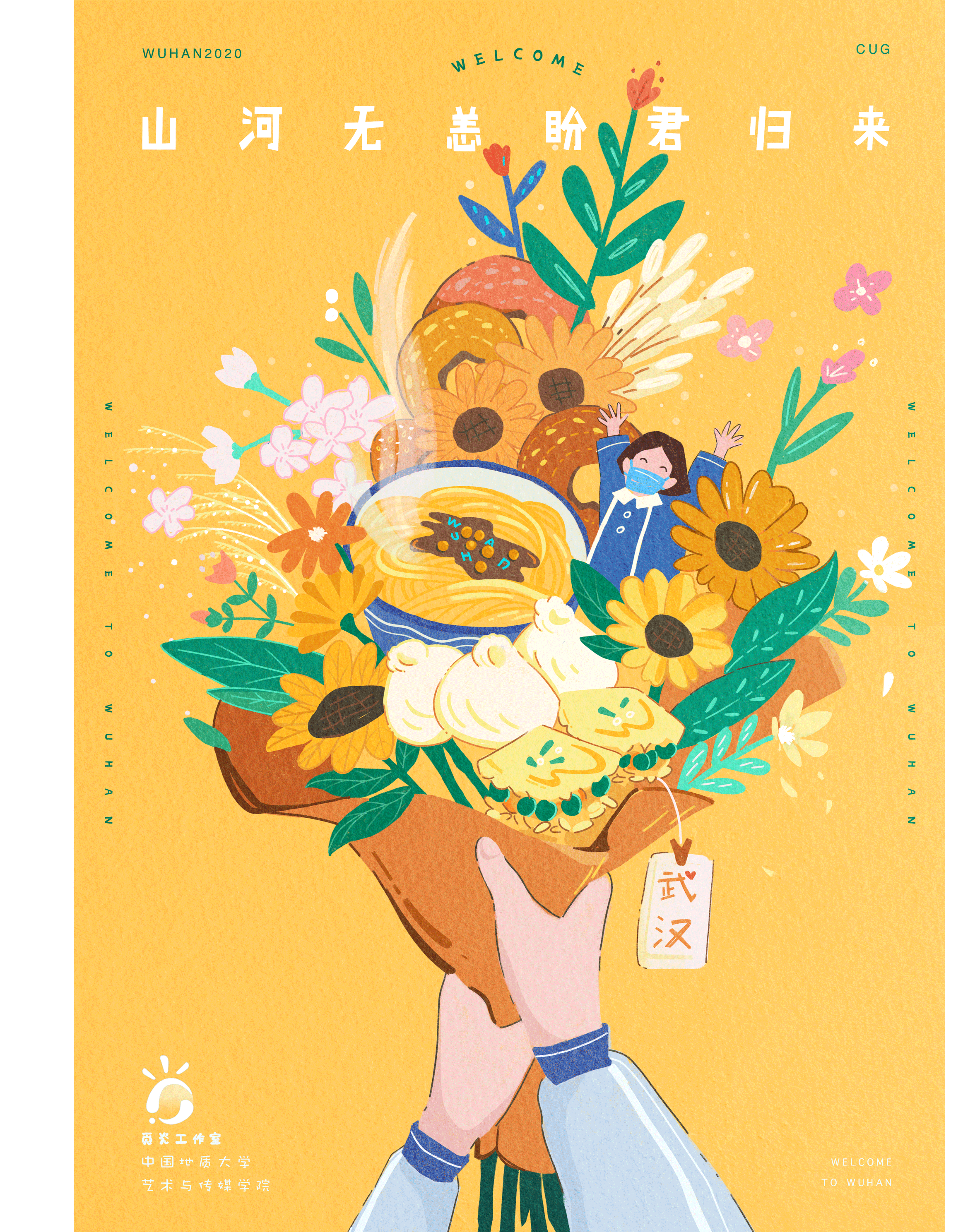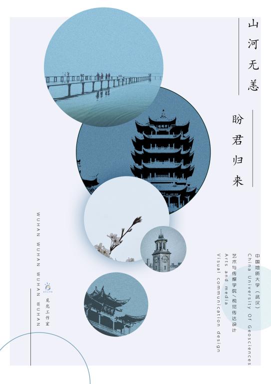 视觉传达专业徐莉觅灮工作室,以“山河无恙,盼君归来”为主题,设计了系列海报作品,欢迎莘莘学子重回武汉。