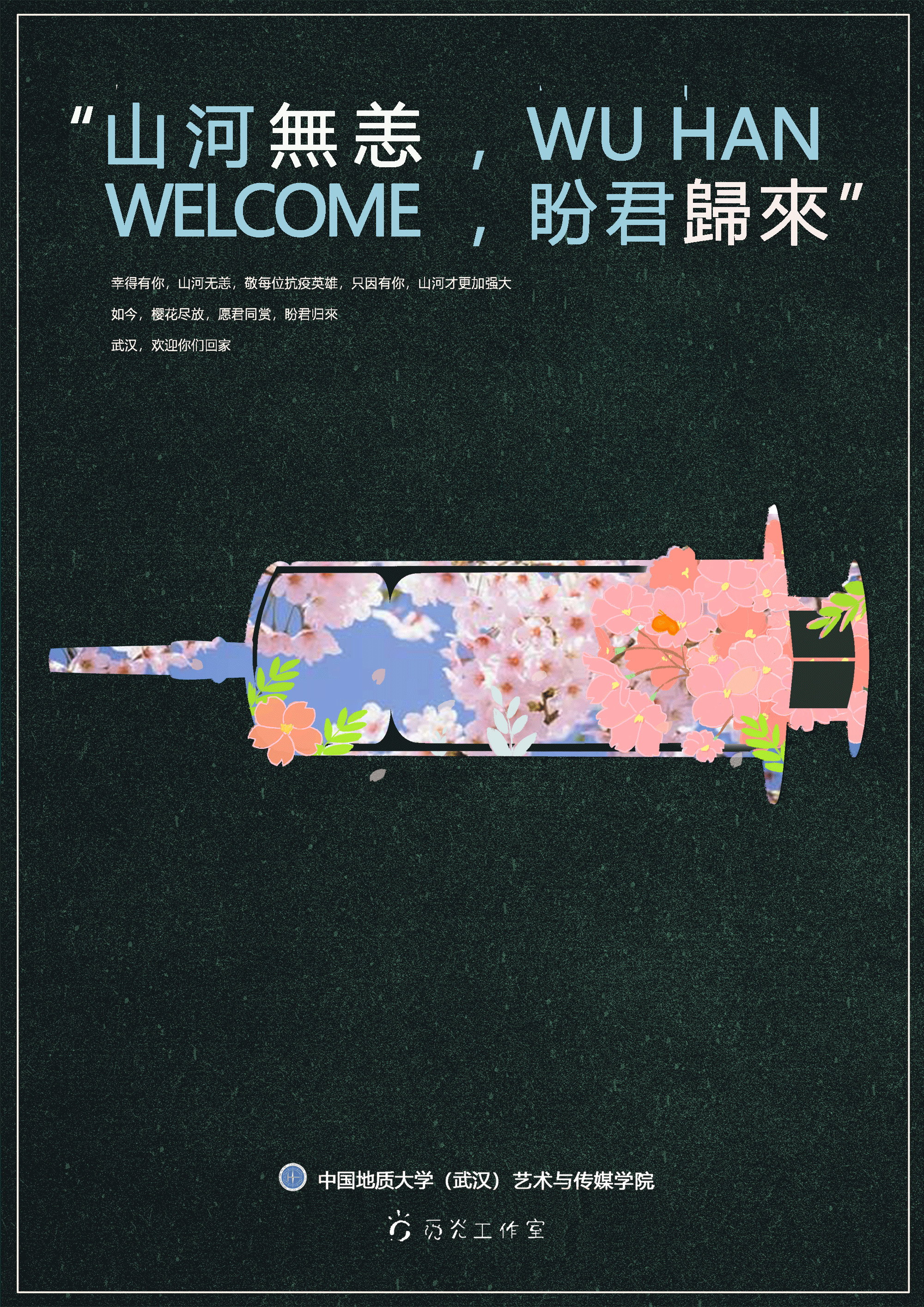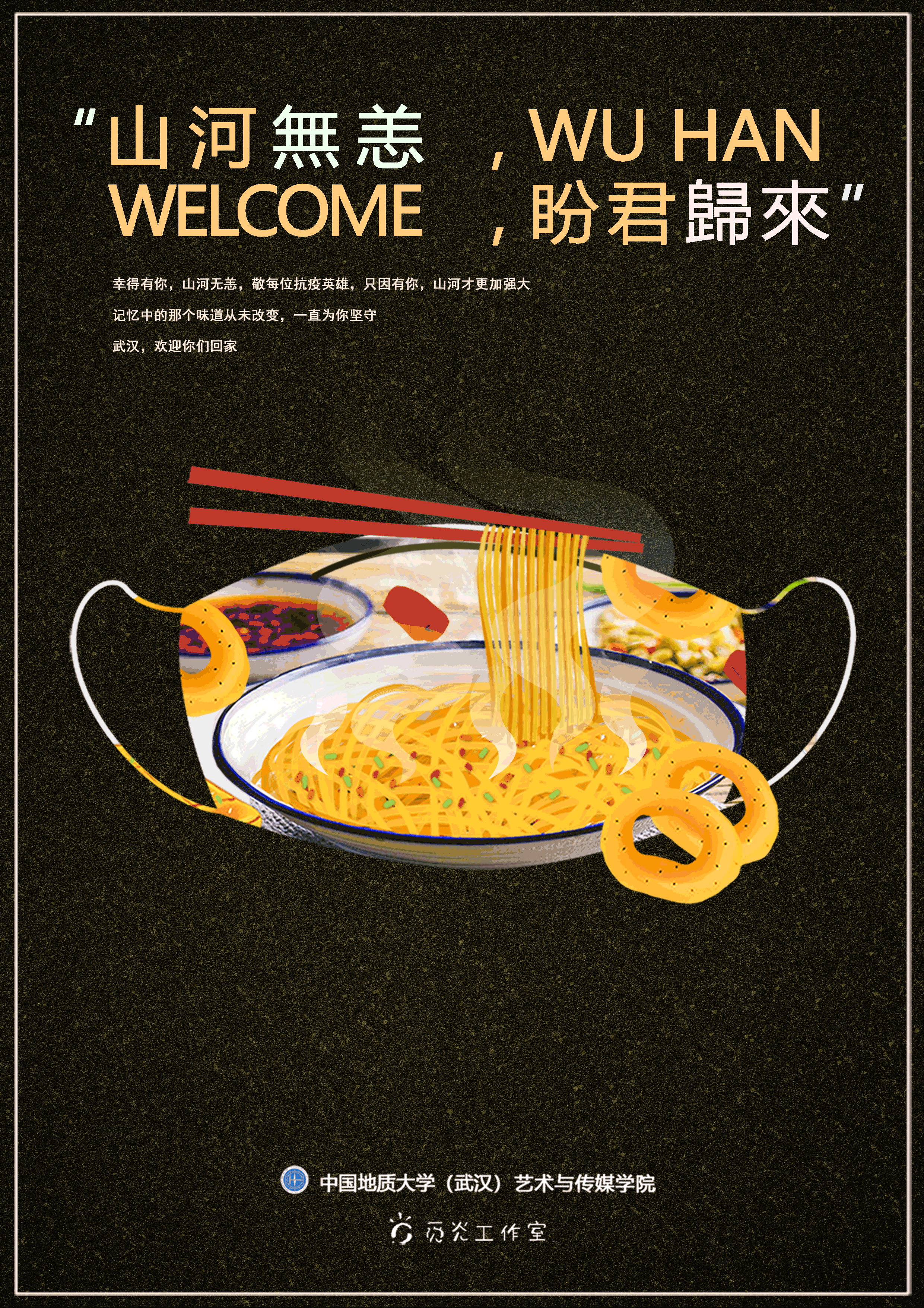 经过两个多月的抗疫后,武汉取得了新的突破,它在逐步复工复产,我们重回校园的时间也越来越近。我们想通过海报,向大家期许:愿春暖花开之际,我们重回武汉,逛一次校园、吃一次热干面、游览一次黄鹤楼等,并大对他们大声的说:“武汉,我回来啦”。