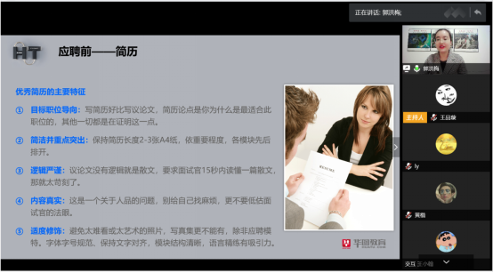 两位校友分享结束后,大家踊跃提问。当问到在线面试时该如何准备时郭洪梅给出建议:首先要先提前熟悉面试使用的软件,尽量减少面试时软件操作失误;其次要保证一个稳定的网速和安静的环境;最后需要保持仪容仪表,必要时可借助美颜网络软件。