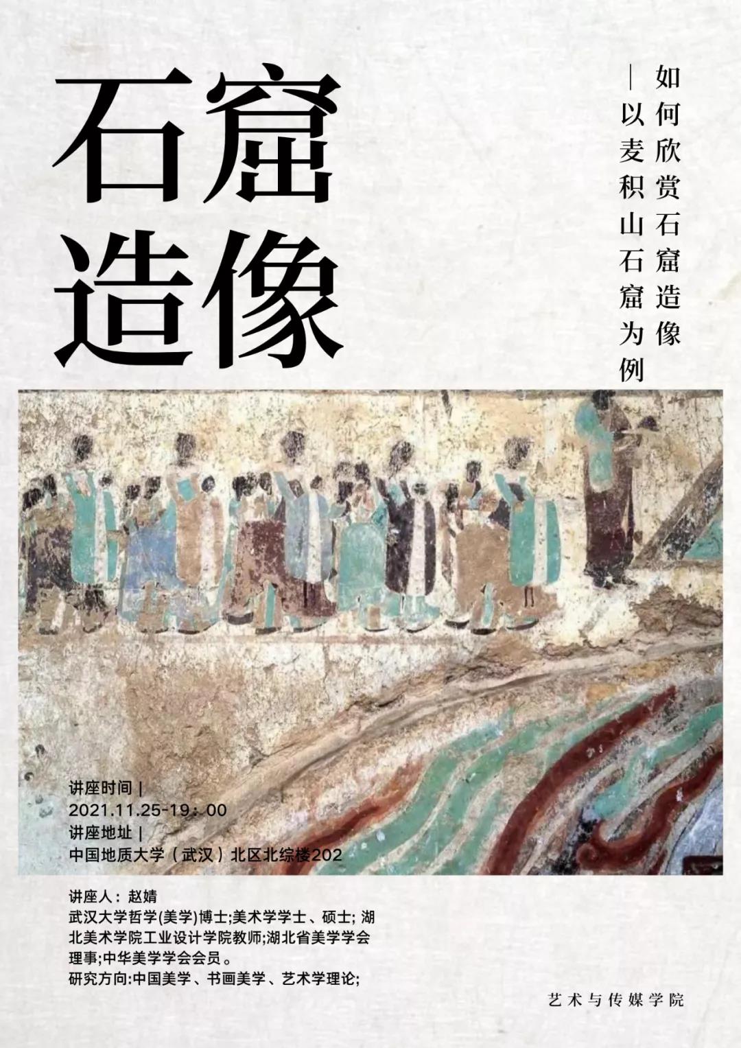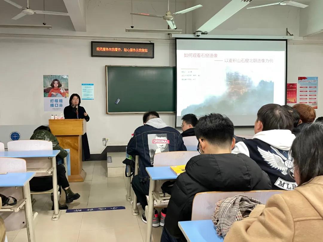 (武汉)艺术传媒学院于11月25日19时于东校区综合楼201室举办了“如何欣赏石窟造像——以麦积山石窟为例”主题讲座。讲座邀请了武汉大学哲学(美学)博士、湖北美术学院工业设计学院赵婧老师为大家讲授这堂精彩纷呈的艺术欣赏课。课堂上,赵老师结合自身研究领域,详细为大家讲解了如何欣赏石窟造像,开阔了同学们的眼界,也为同学们补充了石窟雕塑相关的专业知识。讲座通过口述、图片等方式展示,生动具体,吸引了大家的兴趣和关注。