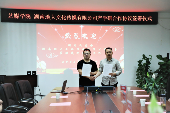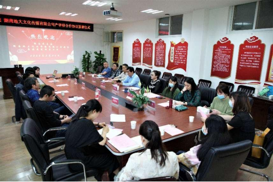 与湖南地大文化传媒有限公司签订产学研全面战略合作协议,副校长赖旭龙、学院领导班子成员及三级单位代表参加会议,会议由学院党委书记郭秀蓉主持。