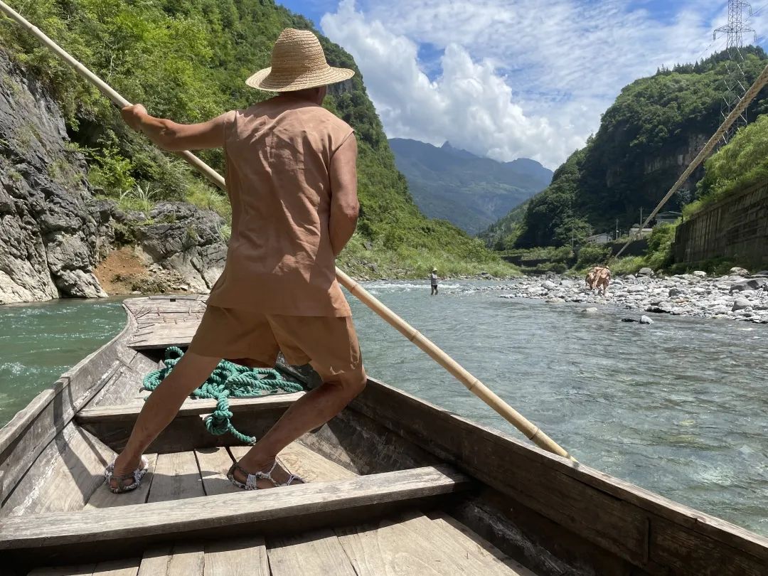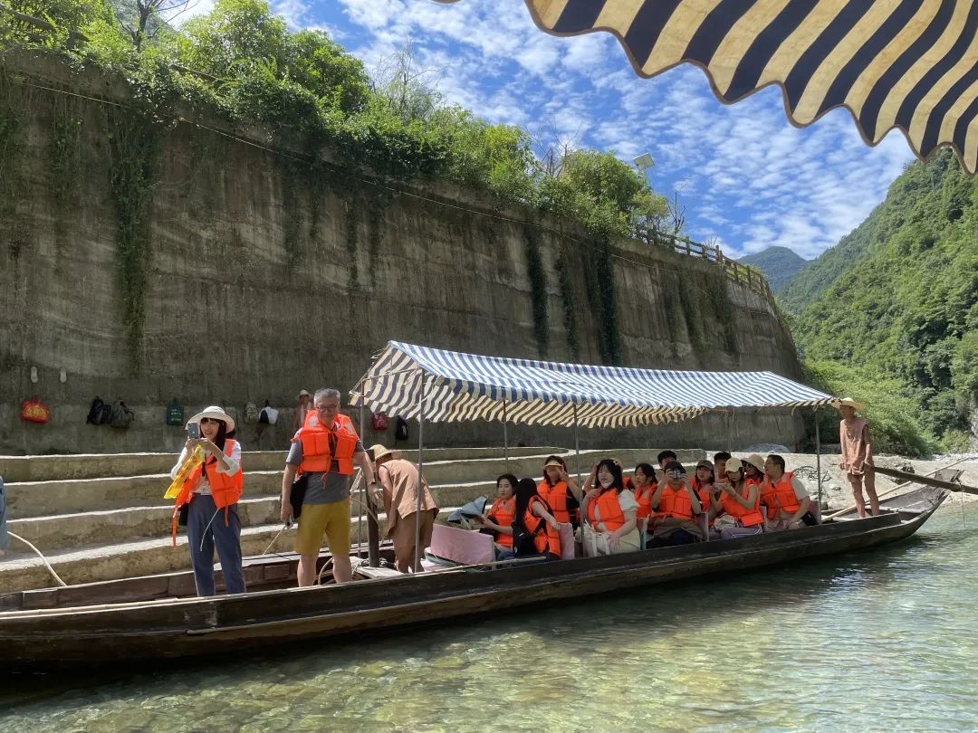 感受过壮丽山水的魅力后,我们下船继续深入神龙溪,感受纤夫文化。至情至性的巴族人,在这片富硒的水土上劳作。在青蓝色的溪水上撑一搜小船,银河倾泻在眼前,碧波流淌在脚下,山川映入眼帘。纤夫们在延岸的小路上,奋力的拉着小船,阳光照耀在他们黑黝的皮肤上,脸颊上一滴滴的汗水散发着光芒。船夫在船头唱着山歌,同学们也热情的回应,活力四射。