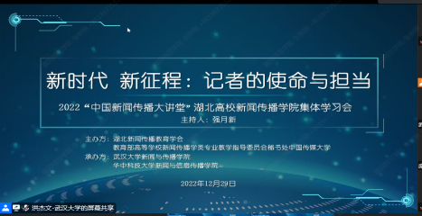 (通讯员于梦涵 王琦)2022年12月29日下午是支部主题日活动时间,为创新支部学习形式,进一步深入贯彻学习党的二十大精神,下午14:30,新闻传播系支部组织动员师生参加以“新时代 新征程:记者的使命与担当”为主题的2022年中国新闻传播大讲堂——湖北分会场在线学习会,来自省内23所高校、2000余名师生参加,韩国三级