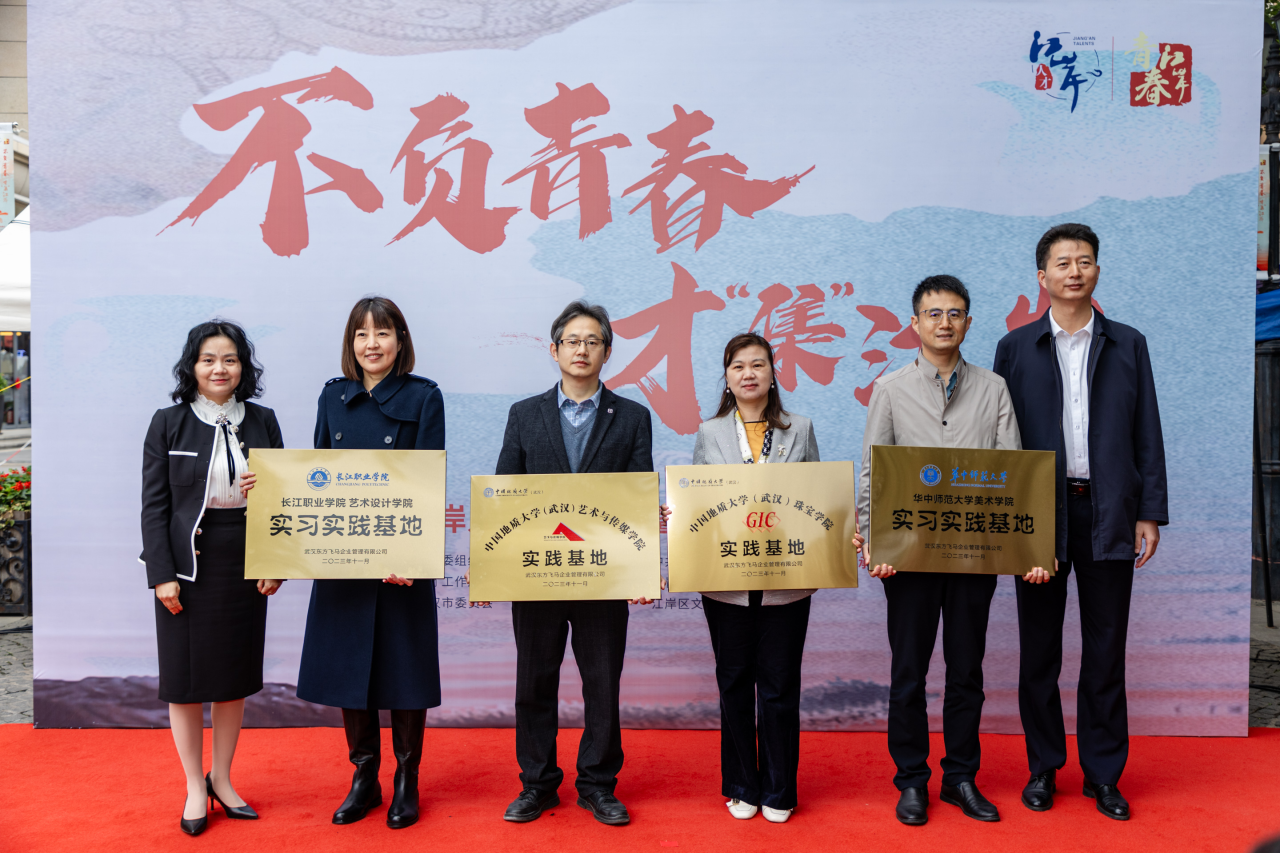 院长何清俊教授、学工组辅导员曾戈晖以及学院学生代表一同前往汉口历史文化风貌街区黎黄陂路步行街参加2023年江岸人才青春市集暨数字文化人才创新基地揭牌仪式活动。