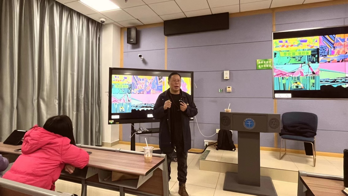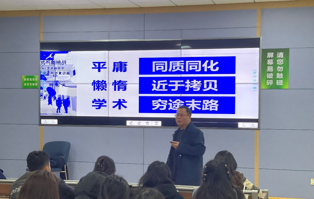 叶教授通过以实践作品以及学生作品为例,与同学们进行激烈讨论,鼓励同学们与时俱进,充分利用AI进行人性化艺术作品创作,亦要保持创新思维。叶佑天教授提出在未来,红色视觉设计、诗意动画和人性AI艺术创作,未来三者必然形成一种合力,达到一种“互为”关系,人性AI艺术创作为红色视觉设计和诗意动画提供生命之美、智慧之灵、智能之灵和美斗智慧的视觉表达,融入中华优秀传统文化的元素和精神,展现中华民族的创造力和智慧,反映时代主题和社会问题,传播正能量和价值观念,展示中国形象和国际影响。