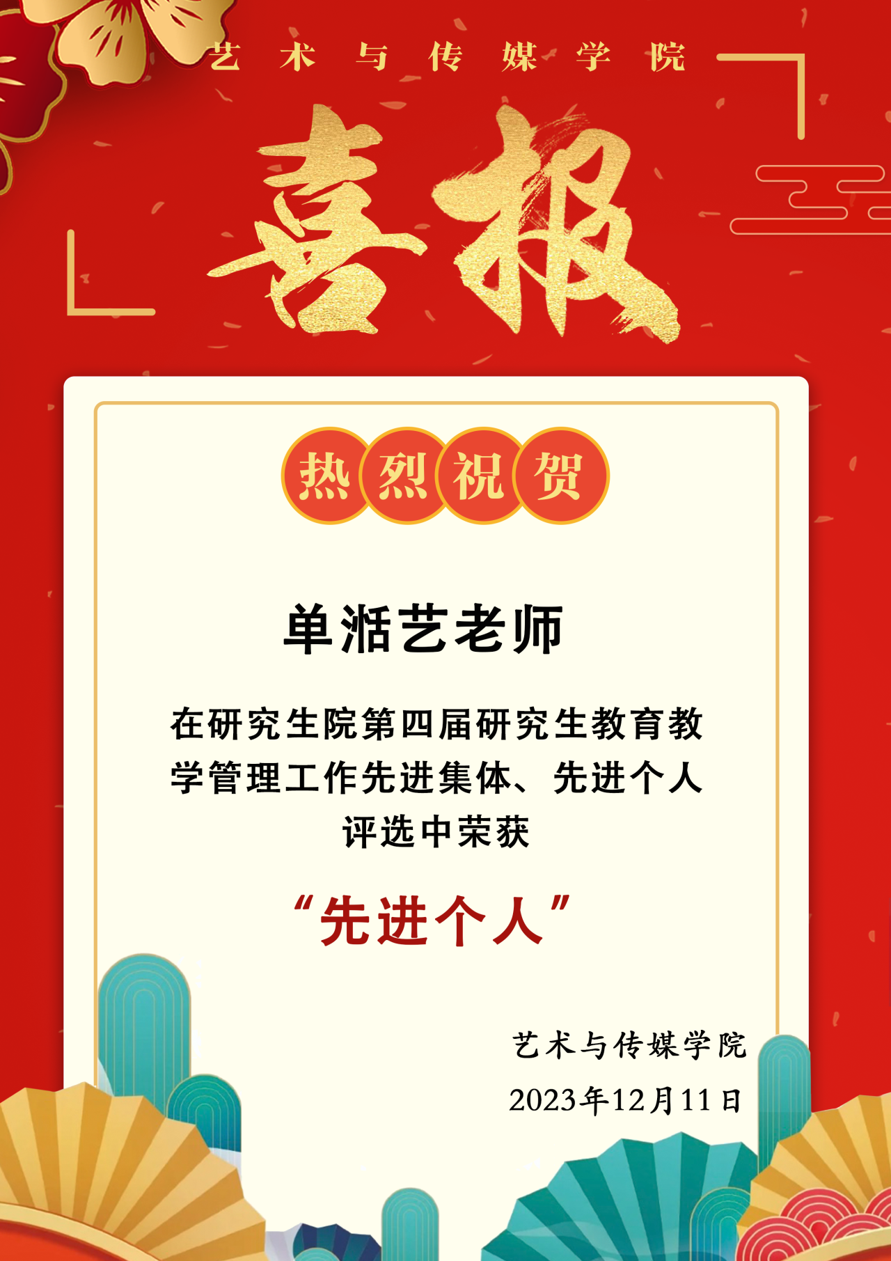 喜报 | 热烈祝贺韩国三级 单湉艺老师荣获研究生院第四届研究生教育教学管理工作“先进个人”