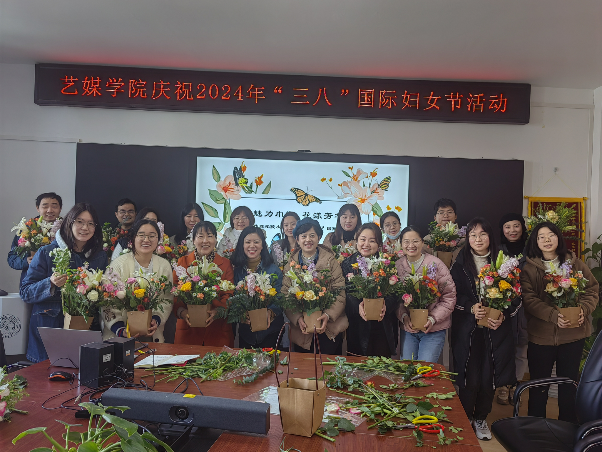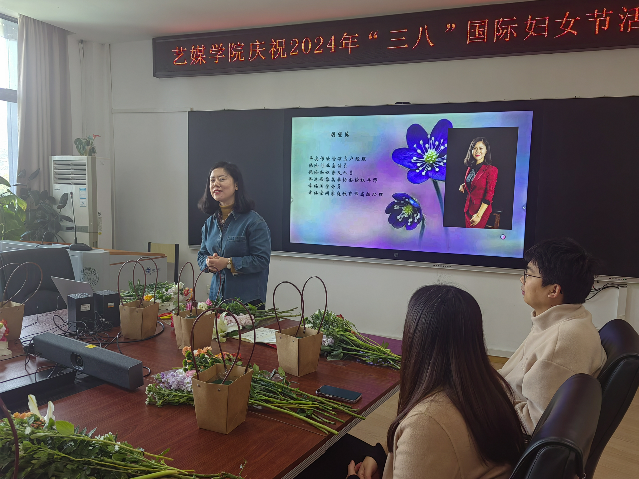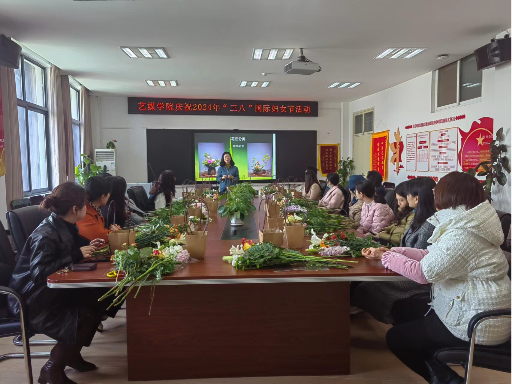 1209会议室举办“魅力巾帼,花漾芳华”花艺沙龙,由学院工会主席周黎主持。