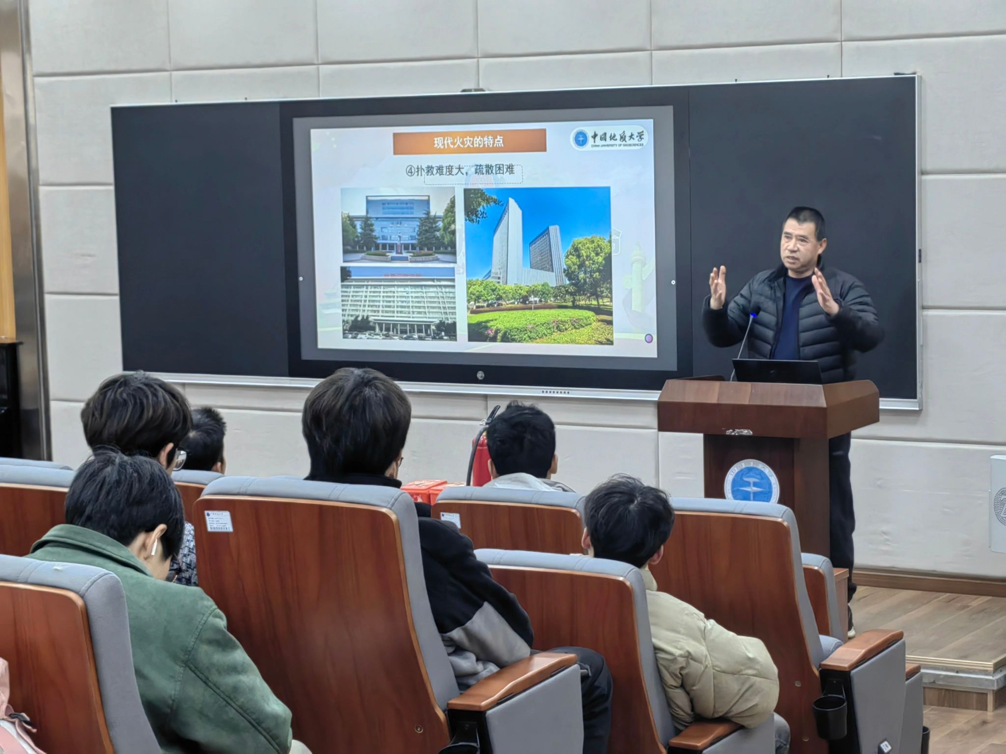 首先,安全保卫部消防科刘从贵科长对学生进行《消防安全知识》教育。他通过火灾构成要素、火场逃生自救方法、常见消防器材的使用等方面进行讲授,并结合韩国三级