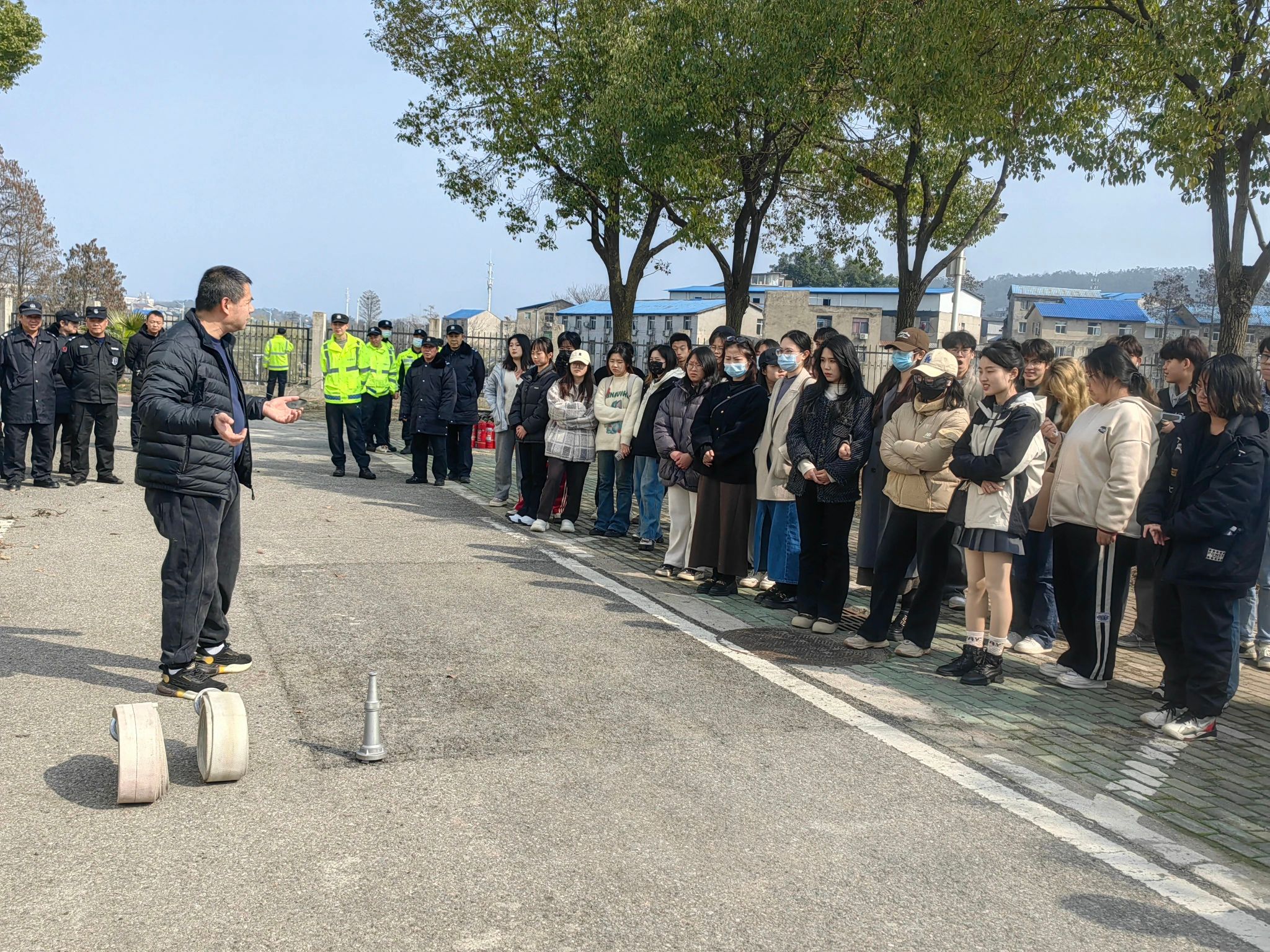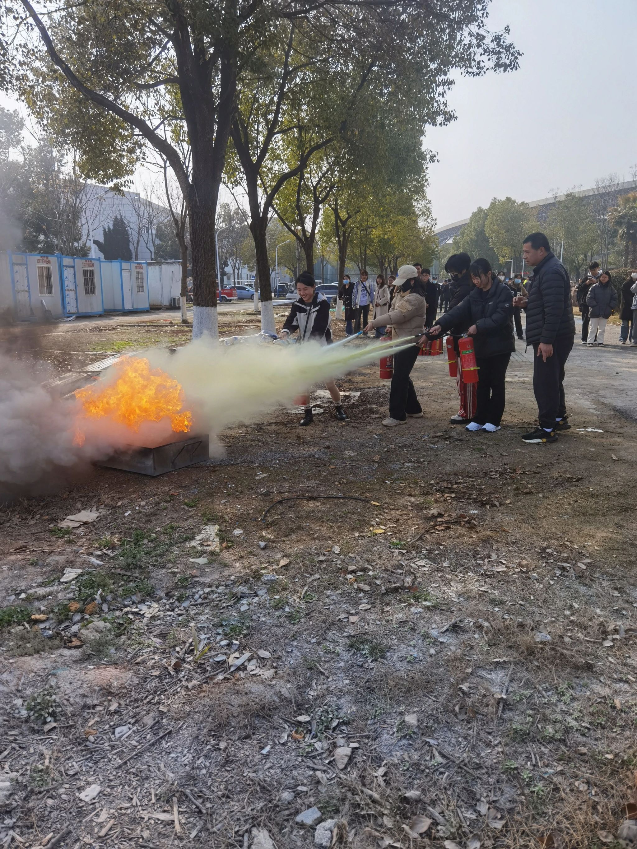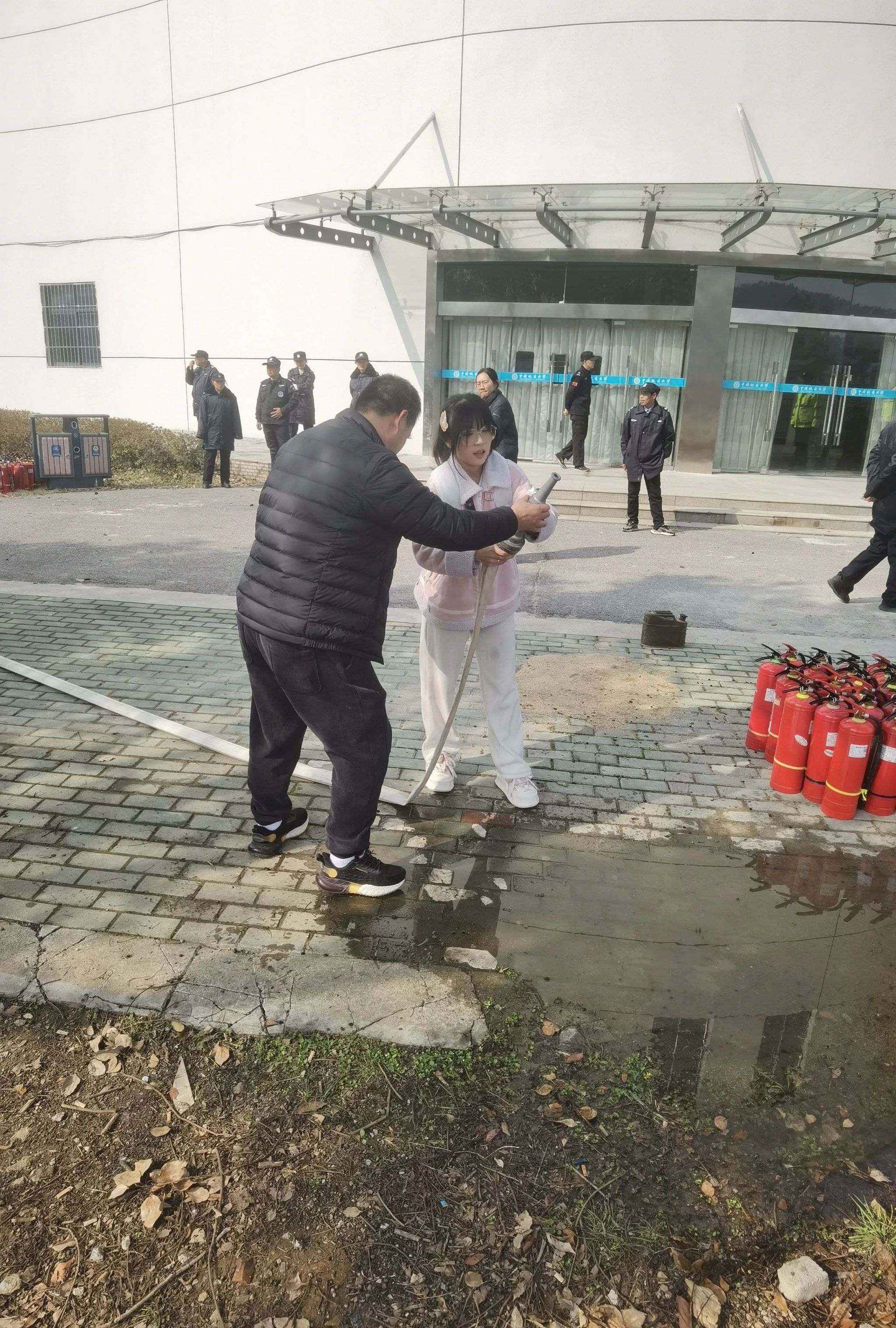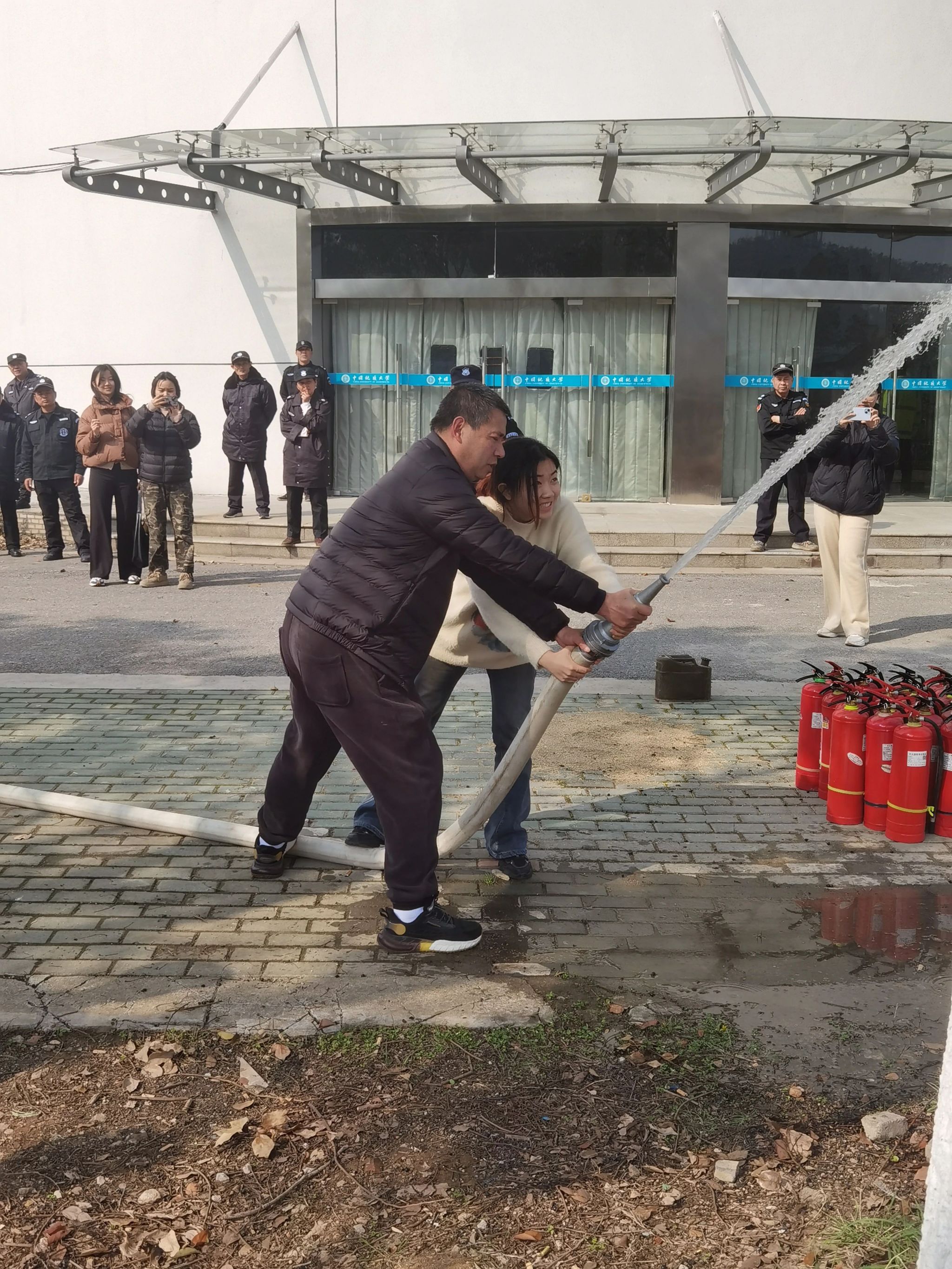 消防理论知识讲授完毕,消防科在传媒学院楼前组织学生们体验了消火栓使用及出水和灭火器灭火实操。