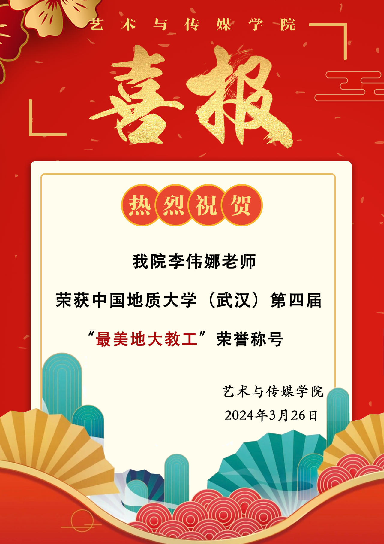 自2011年来到地大起,今年是李伟娜同志来艺媒学院工作的第12个年头。她2011-2021年担任学院组织人事秘书,同时2017年-2021年兼任院直党支部书记,2021年底担任学院办公室主任工作。曾先后4次荣获学校优秀共产党员称号,在平凡的工作岗位上书写了不平凡的业绩。作为组织人事秘书,她积极协助各专业和学院领导在引进人才和招聘优秀毕业生方面做了大量细致琐碎的工作,近5年学院共引进学科骨干人才3人、青年优秀人才3人、优秀博士2人。职称评审和聘期考核直接关系到老师们的切身利益,针对艺术类老师的学科特点,在认定相关成果过程中,她多次与学校有关部门沟通,解释,既尊重了“红宝书”的规则,也兼顾到了老师们的利益诉求。作为党支部书记,疫情期间她带领支部党员冲峰在前,创造了学院教工党支部志愿服务参与人数最多,服务时长最多的记录,她在学院率先开展支部领学制度,使人人参与学习,大大提高了支部学习效果,此项典型做法在全院师生党支部推广。作为学院办公室主任,她系统谋划,统筹推进,除了完成办文办事办会等日常工作外,在学院网站建设与维护、舆论监督、财务管理等方面也取得较好的成绩,她带领办公室成员各司其职,高效完成上级部门和领导交办的各项任务。每年参与起草学院的工作计划及年终总结,作为骨干成员参与学院党委换届、行政换届、年度档案归档、“十四五”中期检查等重大专项工作任务。改变的是岗位与角色,不变的是服务师生的初心与使命,她始终坚守着管理育人的阵地,以“用心做、提前做、扎实做”的工作作风,诠释着对教育事业的热爱与责任。