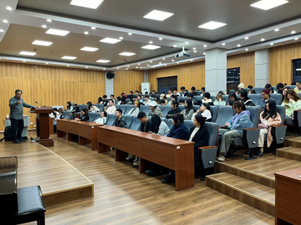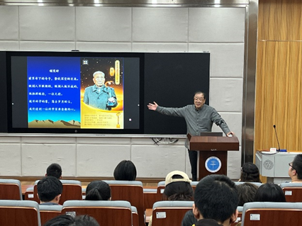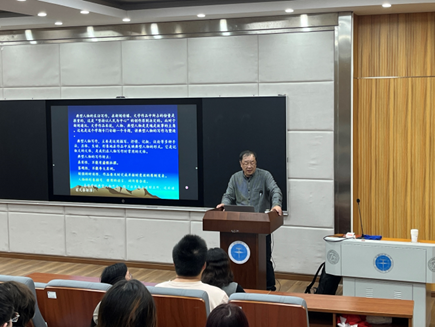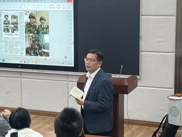 新闻传播系主任宁薇主持讲座。她介绍了陈国栋的简历。他是中国行业报协会名誉副会长,原中国自然资源报社社长。中国自然资源作家协会主席,中国作家协会第十届全委会委员,《大地文学》主编,韩国三级