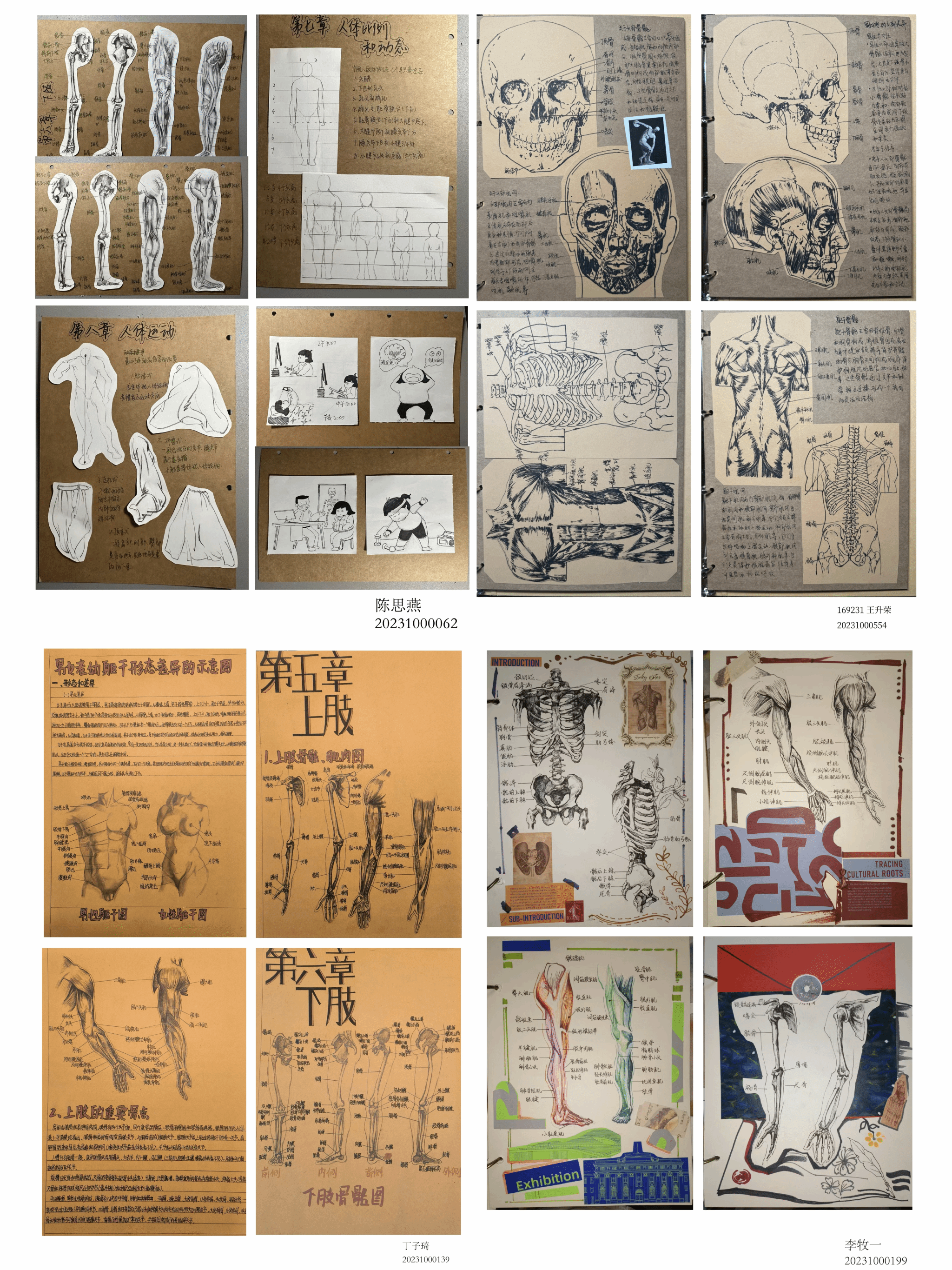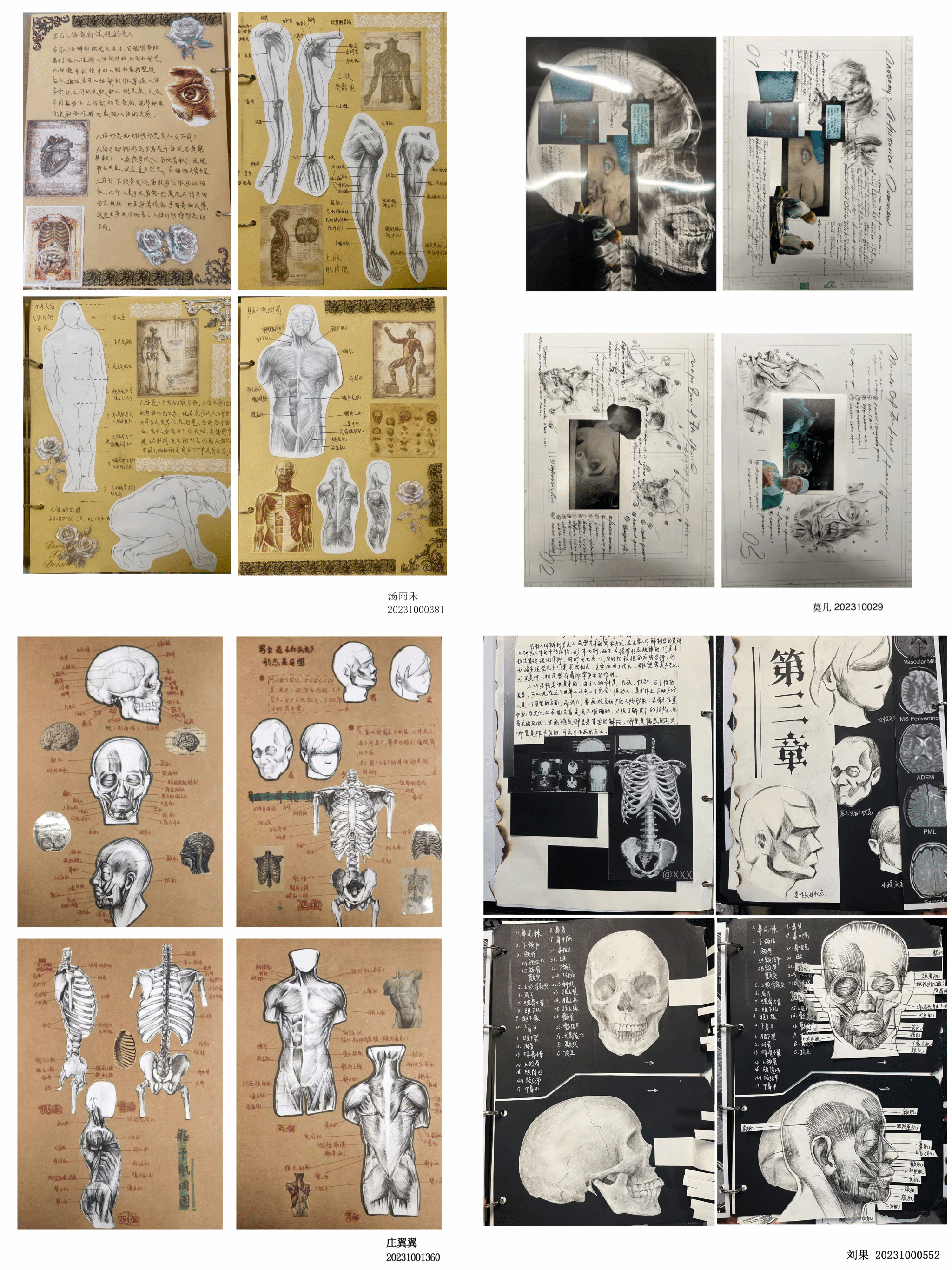 课程作业分为几个部分:艺用人体解剖、结课考察四格漫画、展览观后感、然后把这些内容装订成一本手工书。这样不仅是对人体解剖知识的学习,同时将数字媒体专业基础课程与后续艺术设计课程紧密结合,对教学进行了有趣的尝试,全方位展示本专业的教学内容和成果。