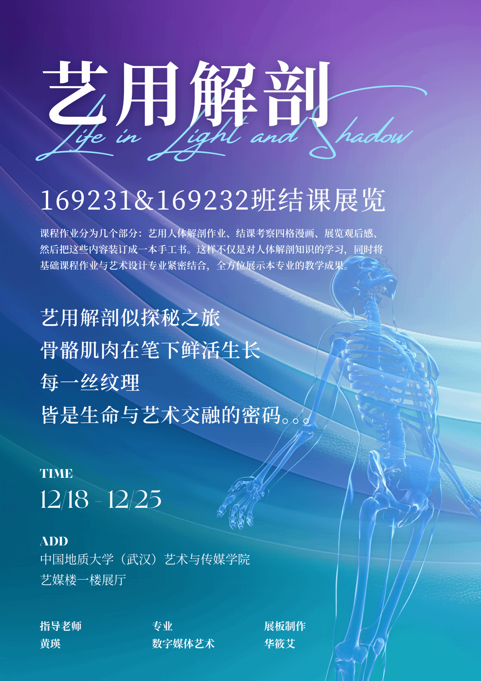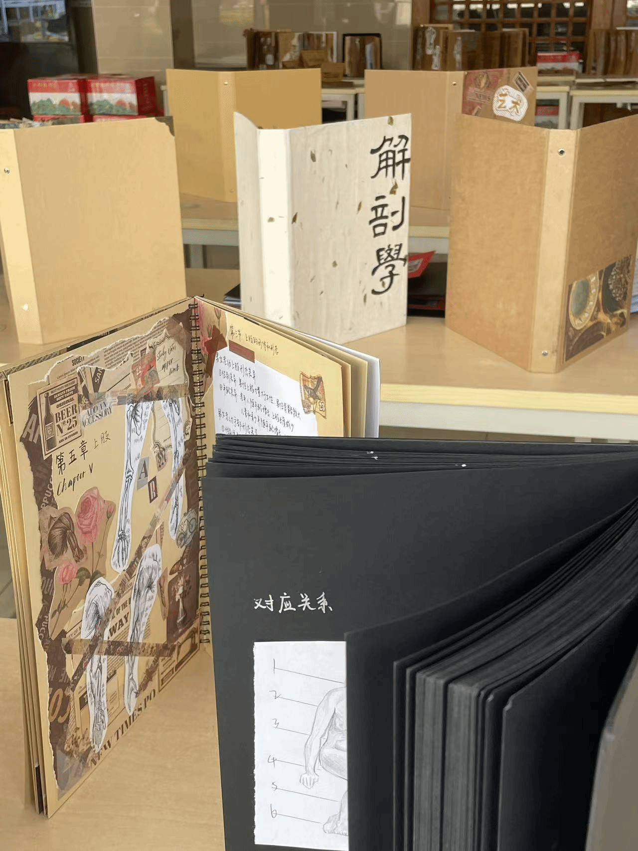 大楼一楼中厅,黄瑛老师指导数字媒体艺术专业169231&169232班的学生们以一场结课展览,展现了艺用解剖学的独特魅力。这场展览展示了学生们对人体解剖学的深刻理解,同时将艺术设计与课程作业紧密结合,以手工书的形式,多角度呈现了艺用解剖学的丰富内涵。