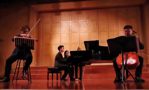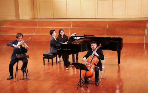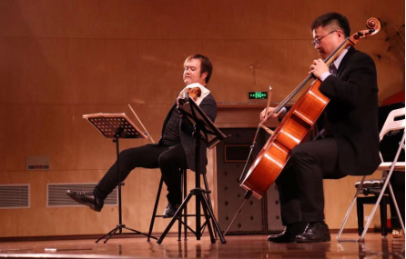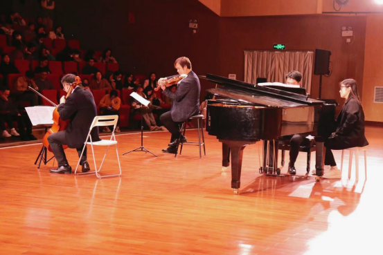 教授、小提琴中提琴演奏家、圣彼得堡国立音乐学院博士、“地大学者”王凯平教授,联合湖南师范音乐学院教授、俄罗斯音乐艺术学科博士、青年大提琴演奏家陈果教授,以及湖南科技大学校聘副教授、俄罗斯圣彼得堡国立音乐学院钢琴独奏、室内乐演奏双博士、旅俄青年钢琴演奏家彭斯特副教授,一同向我们呈现了一场精彩绝伦的视听盛宴。整场音乐会持续一个半小时,分为上、下两场,分别演奏了《拉赫玛尼诺夫g小调钢琴三重奏》与《柴可夫斯基a小调钢琴三重奏》两首知名室内乐作品。