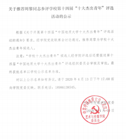 根据《关于开展第十四届“韩国三级 十大杰出青年”评选活动的通知》要求,经学院党政联席会讨论通过,推荐周黎为学校十大杰出青年候选人。