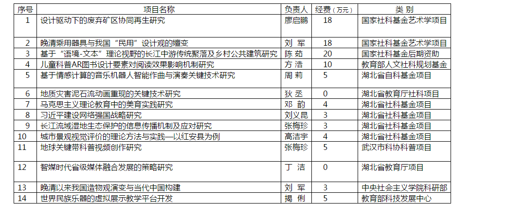 一直重视科研实力的提升,在申报项目时通知动员及时到位,申报过程中跟踪服务到位,在制定学院绩效考核时强调以学术成果为导向的评价体系,经过全院教职工共同努力,今年在纵向科研项目获批的数量、级别和经费方面均实现历史突破,共获各类纵向项目14项,其中国家社科基金艺术学项目3项,教育部社科规划基金1项,国家其他部委项目2项,湖北省社科基金4项,湖北省自科基金1项,湖北省教育厅项目2项,武汉市科协项目1项 ,到位经费98万元。