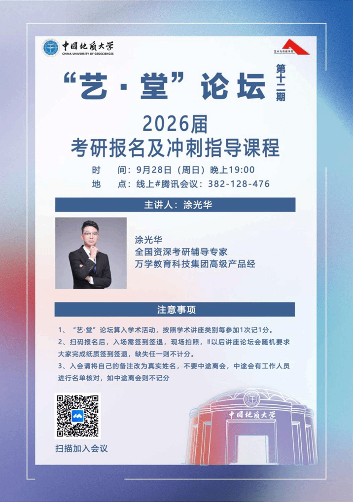 于线上举办了第十二期 “艺・堂” 论坛2026届考研报名及冲刺指导课程。本次分享会邀请了全国资深考研专家、万家教育科技集团高级产品经理涂光华老师担任主讲人,旨在为同学们提供一场内容详实、指导性强的考研全程规划分享。本次活动由兼职辅导员黄灿主持。
