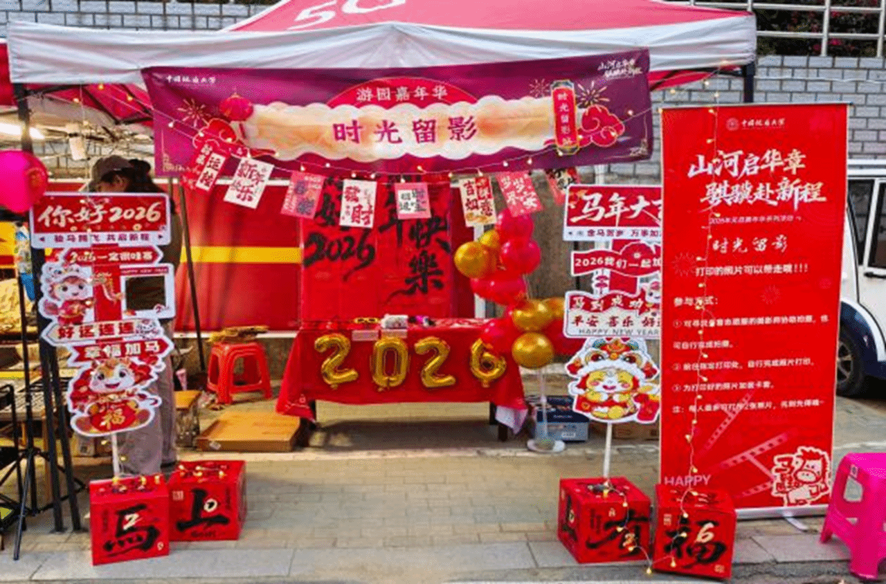 负责的主题摊位筹备了各类跨年装饰道具,为师生提供合影留念与即时打印服务,覆膜封装的照片让师生们的跨年美好瞬间得以留存;游戏互动摊位设置了趣味项目,师生们积极参与、友好比拼,在活动中放松身心,成功闯关者获得定制礼品。