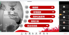 期间周老师首先表达对同学们的关心,叮嘱大家注意身心健康,并再次强调纪律的重要性,叮嘱同学们一定遵守学校的规章制度。同时关心同学们的网课完成度,叮嘱大家在家也要不忘学习,在放松身心的同时兼顾好学习。班长组织分享了相关抗疫故事及习近平总书记关于疫情防控工作的重要精神讲话,其目的在于坚定同学们的抗疫决心。