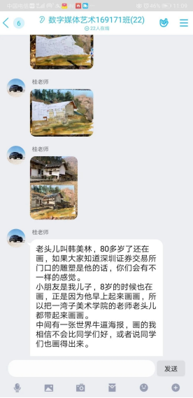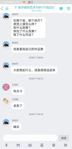 紧接着班主任桂老师让同学们逐个发言2到3分钟,主要是让大家汇报一下最近在哪里,身体情况怎么样,上课效果如何有无困难和近期参加了什么竞赛做了什么作品。同学们依次发言,说明最近情况。桂老师强调现在已经是大三下学期了,同学们要认真对待每一门功课,多参加些比赛项目,高度重视自己的作品集。同学们积极和老师讨论学术相关问题,并提出自己的意见想法。有的同学把最近自己关注的比赛,宣传发到群里和大家一起分享,桂老师也分享了一些有趣的设计类小视频,最后叮嘱大家一定要多画多做,就算画的还不是很好手头功夫也不能落下,要是有任何学习上的问题一定要及时向院里汇报。