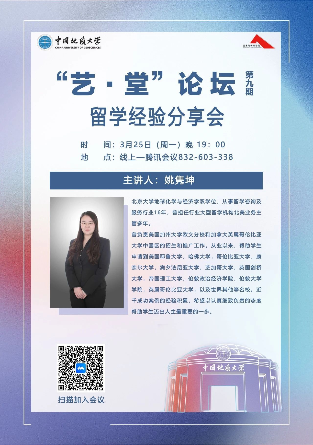 2024年3月25日晚上19:00,“艺·堂”论坛第九期留学经验分享会顺利举行。学院邀请了姚隽坤老师为同学们进行留学经验的分享。本次讲座由兼职辅导员廖文琦主持。