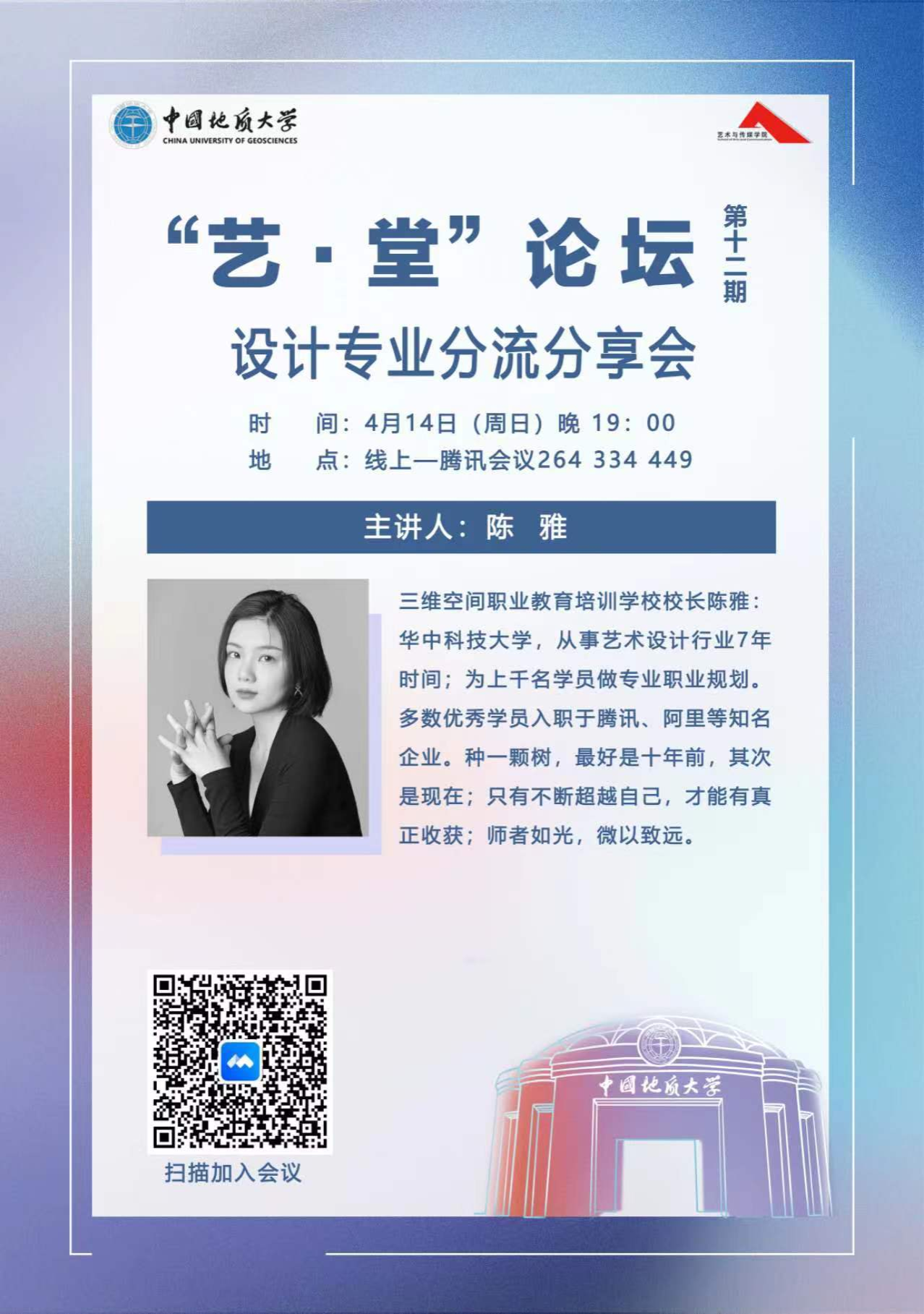 2024年4月14日晚上19:00,“艺·堂”论坛第十二期设计专业分流分享会顺利举行。学院邀请了三维空间职业教育培训学校校长陈雅老师为同学们进行了有关设计专业的分享。本次讲座由兼职辅导员王琼逸主持。