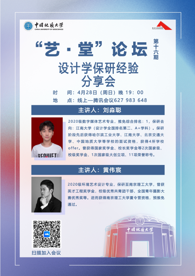 2024年4月28日晚上19:00,“艺·堂”论坛第十六期设计学保研经验分享会顺利举行。学院邀请了2020级本科生刘淼聪和黄伟宸为同学们进行保研经验分享。本次讲座由兼职辅导员廖文琦主持。