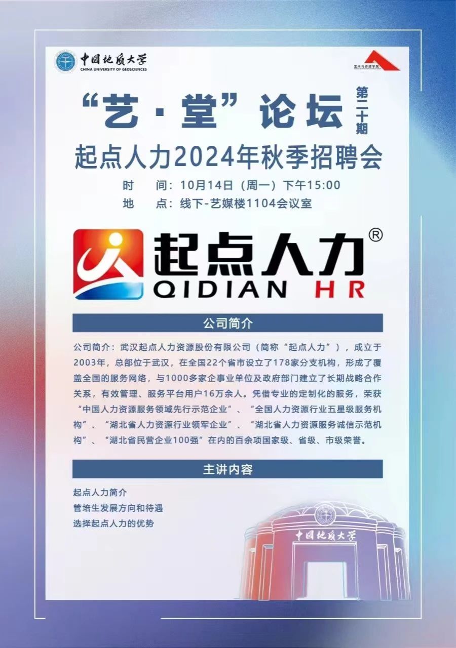2024年10月14日下午15:00,“艺·堂”论坛第二十期——起点人力2024秋季招聘会于艺媒楼1104报告厅顺利举行。起点人力负责人樊梦梅经理从公司介绍、产品介绍、公司优势和岗位介绍四个方面进行宣讲。本次会议由兼职辅导员廖文琦主持。