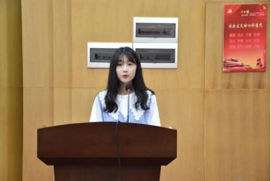 典礼第五项,由2020级研究生新生代表肖明珠同学发言,她认为读研是一种磨砺,可以提高自己的知识水平和加深学科了解,享受人生中为数不多的沉浸式学习时光,并发出呼吁:牢记国家担当,责任担当,使命担当,不负韶华,在学校提供的优良环境下,脚踏实地地拼搏,积极勇敢地创造,做乘风破浪的“地大人”。