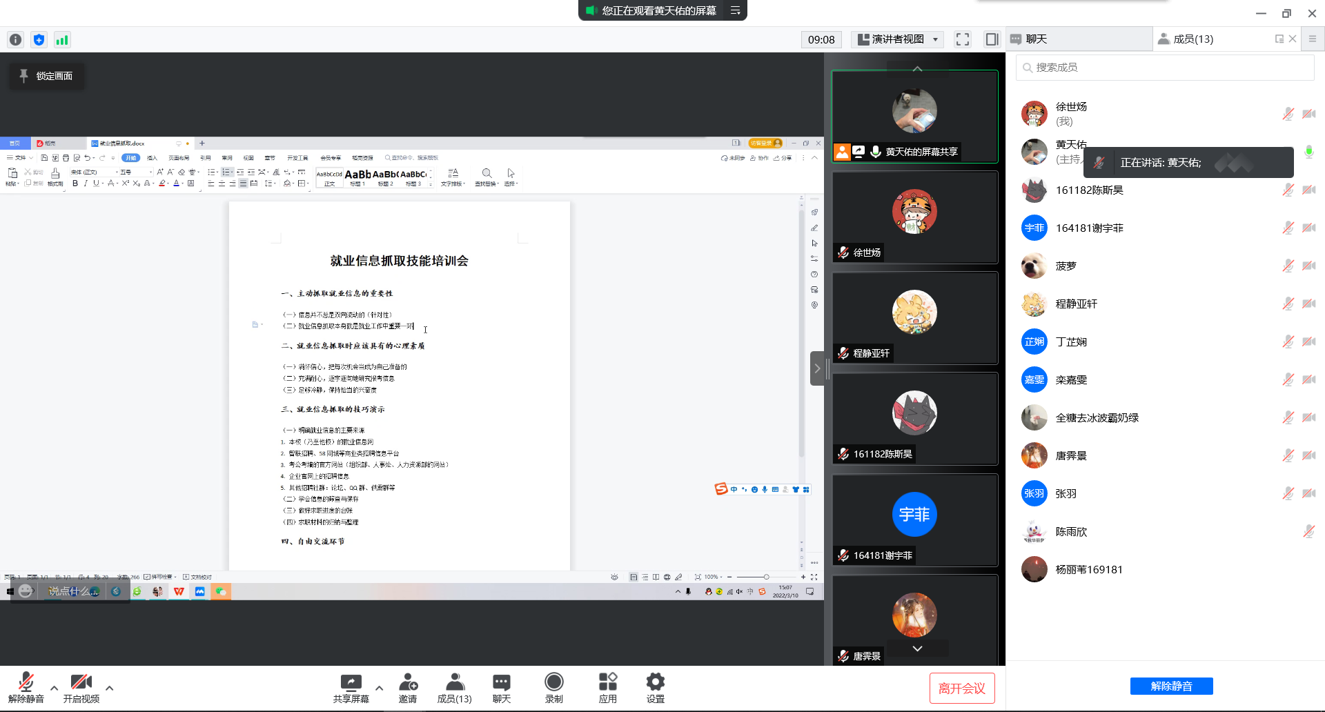 黄天佑老师本别从就业信息抓取的重要性、应具备的心理素质、技巧演示三方面展开培训,通过共享屏幕的形式,向同学们演示如何从学校就业信息网、商业类招聘信息平台、考公考编的官网搜索信息、筛查指标、制作台账。他指出,同学们在就业申请过程中要满怀信心、充满耐心、足够冷静,提前准备好求职材料,并定期关注求职进度,养成良好的求职习惯。