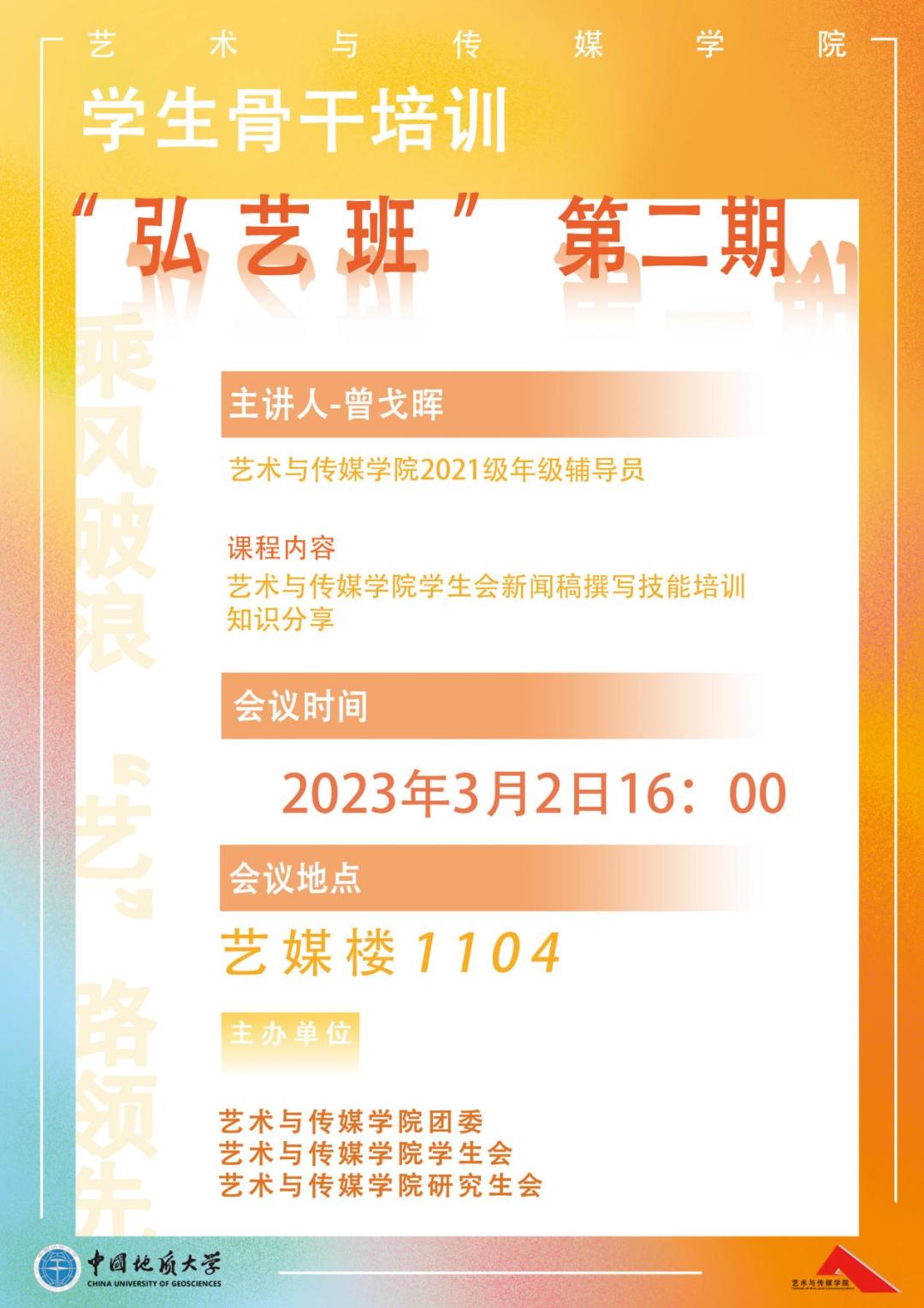 2023年第二期“弘艺班”学生骨干培训在艺媒楼1104报告厅顺利展开,学院研究生会和学生会的全体学生干部参加了本次培训,培训由韩国三级