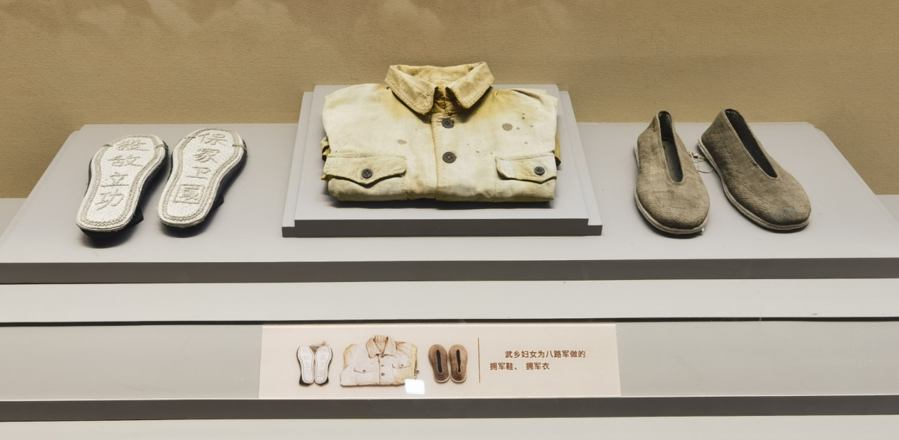 太行精神是为民族解放万众一心、敢于胜利的精神。国难当头,教师和学生走上街头,投笔从戎,他们壮情写道:“捍卫祖国的责任是我们的,我们应当为了祖国的生存流最后一滴血”。妇女们不仅在后方没日没夜纺线织布,缝制军鞋,也有巾帼扛起大刀,战斗在前。广大群众组织起担架队、运输队、警戒队,运送物资,救护伤员,打扫战场,维持治安,使战争的军需供应和战勤服务得到了充分保障。“母亲叫儿打东洋,妻子送郎上战场”。在党的领导下,华北敌后抗日根据地不断壮大,形成万众一心,团结一致的全民抗战热潮。我们在这些文物前驻足停留,为军民“鱼水一家亲”的感情深深动容。