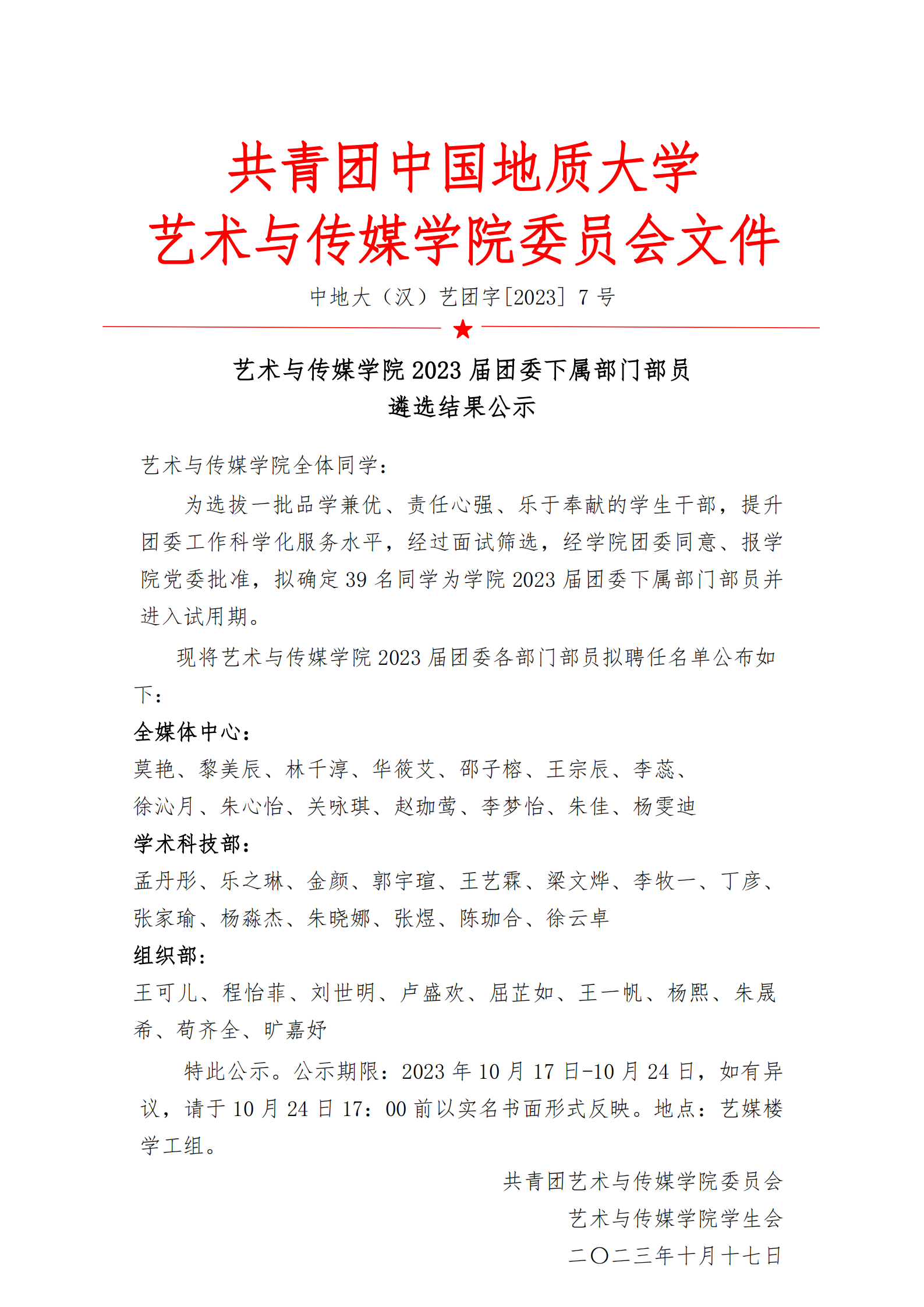 通知 | 韩国三级 2023届团委下属部门部员遴选结果公示