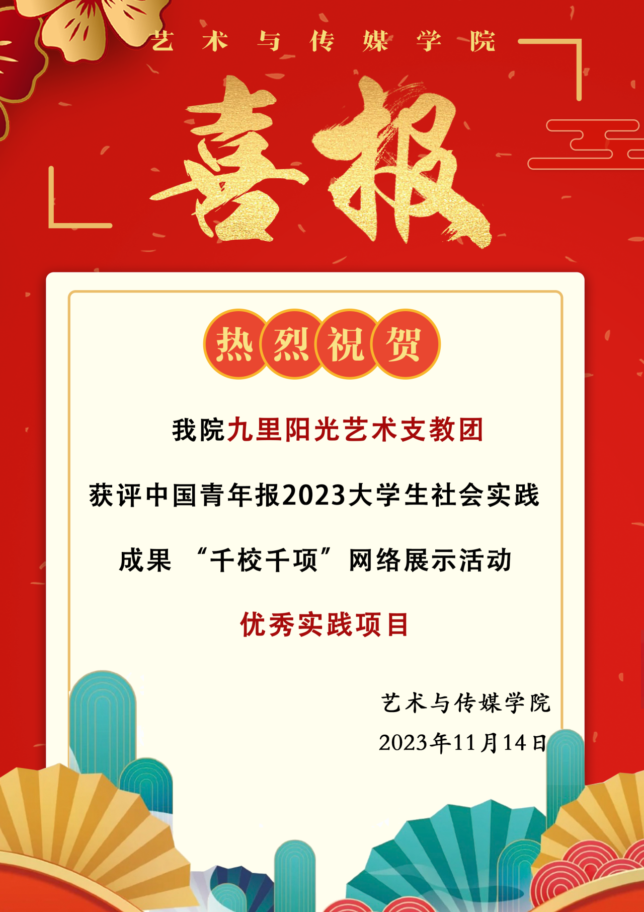 喜报!韩国三级 九里阳光艺术支教团获评中国青年报2023大学生社会实践成果“千校千项”网络展示活动优秀实践项目