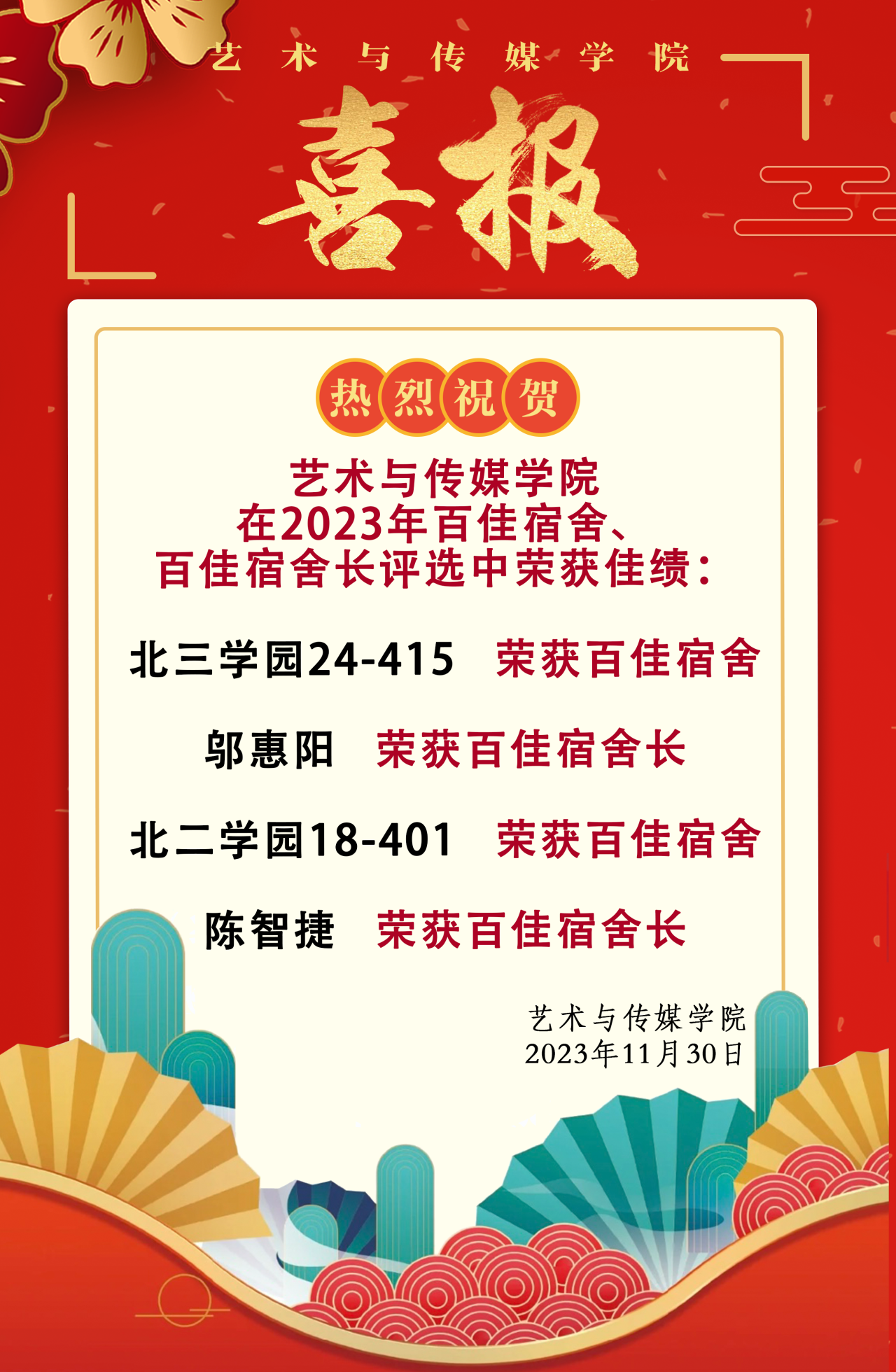 喜报!热烈祝贺韩国三级 在2023年百佳宿舍、百佳宿舍长评选中荣获佳绩!