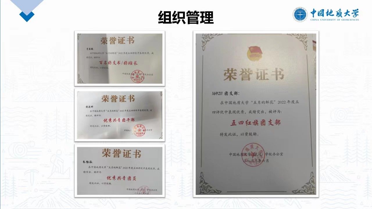 努力完成上级组织交给的各项任务,切实完成专业分流、综测评定、贫困认定以及宪法学习等各项任务。 在全体班委和同学们的努力下,本班从未出现违规违纪的事情。在此基础上,团支部被评为校级“五四红旗团支部”,团支书贾奕璇荣获“校级百名好支书”,班长刘武科荣获 “校级优秀共青团干部”,多名同学获得院级优秀共青团干和优秀共青团员,所有的成绩都为创建优秀班级打下了坚实的基础。