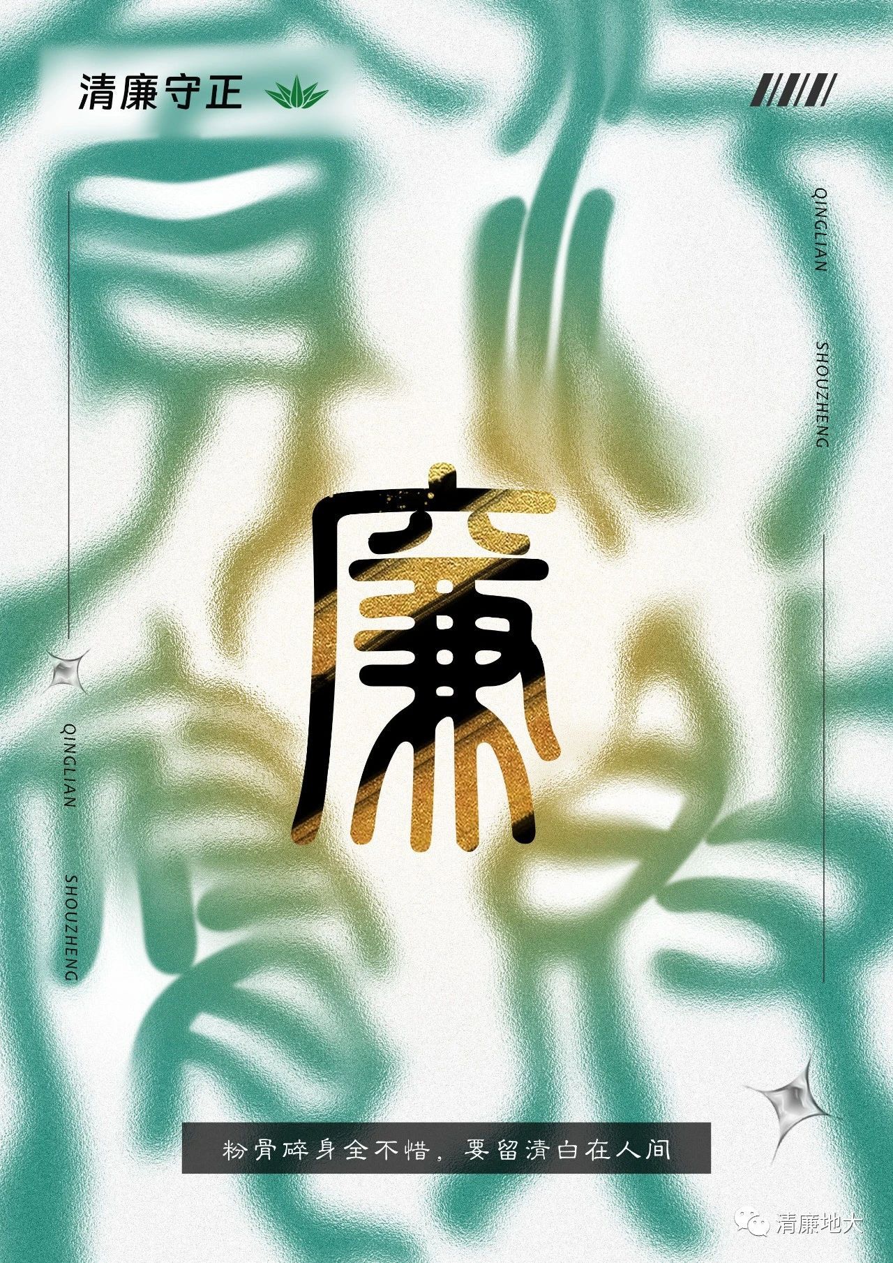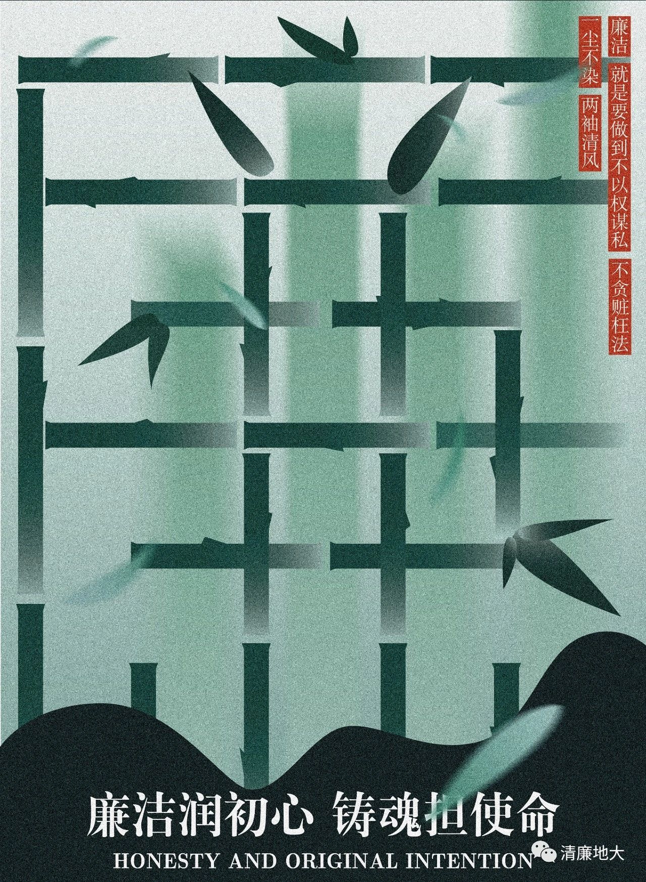本作品以“竹节”替换笔划,拼成廉字,以此将竹与廉进行了结合,紧扣主题。构图上采用居中对齐的方式,将主体“廉”字放大占满版面,突出主题,同时在版面下方将山石进行了扁平化的处理,一在体现竹自山石而生却依旧挺拔的坚韧之性,二在用山石作为韩国三级