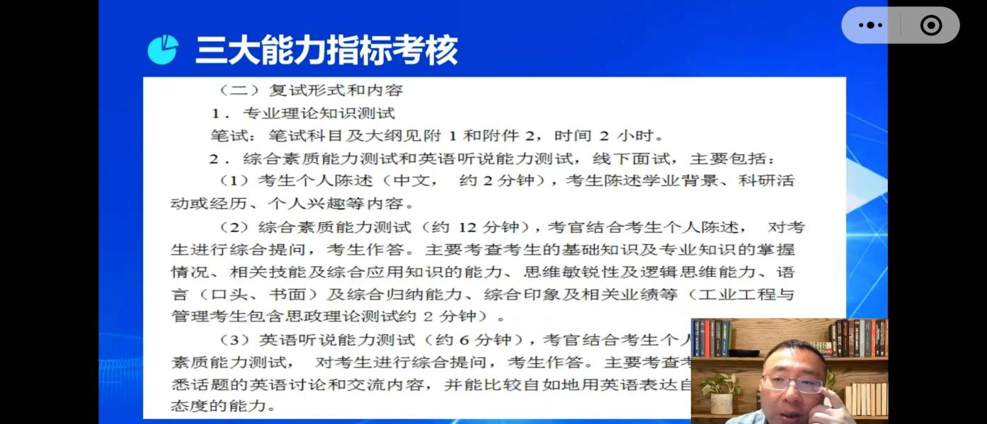 的具体专业展开考核项目的内容解读,谭老师表示考研复试对学生的语言表达能力要求较高,希望同学们可以提前准备,多加练习。