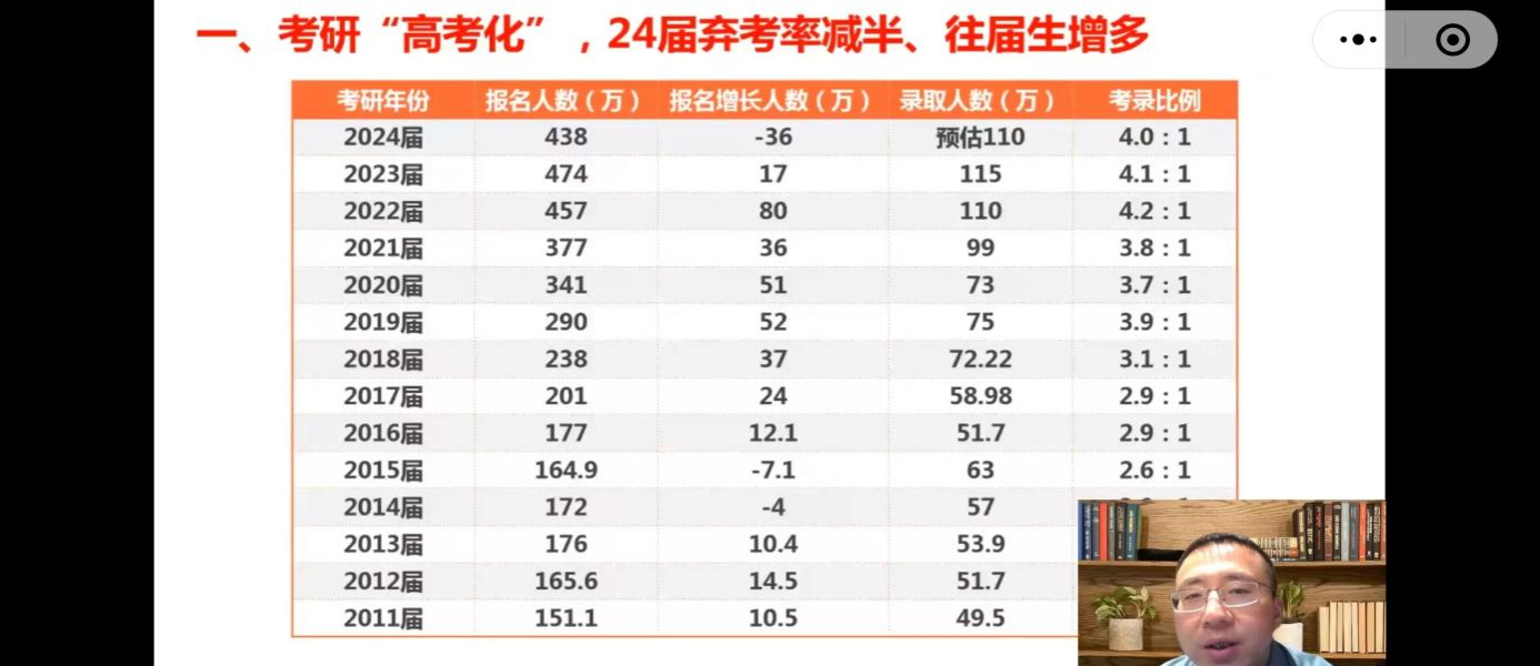 谭校长从24届考研形势分析、考研复试考核本质、复试调剂流程解读、考研复试备考四个方面为学生们展开讲解。首先,谭校长详细介绍了复试准备的时间轴,并深度分析本年考研的复杂形势,提醒同学们虽然报考人数有所下降,但难度仍不容小觑。