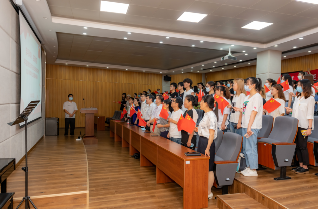 在观看大会直播之前,学院全体师生党员齐唱中华人民共和国国歌,并在学院党委书记郭秀蓉的带领下重温了入党誓词。随着现场灯光渐暗,大家的目光逐渐转移到荧幕,开始观看此次庆祝中国共产党成立100周年大会的直播画面。