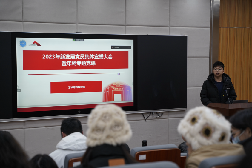 党委在艺媒楼1104会议室召开2022年及2023年新发展党员集体宣誓大会暨年终专题党课。学院党委书记晋曦、党委副书记边建华出席会议,2022年、2023年新发展党员及各支部委员、党建办部门负责人参加本次会议,会议由党建办公室主任陈习良主持。